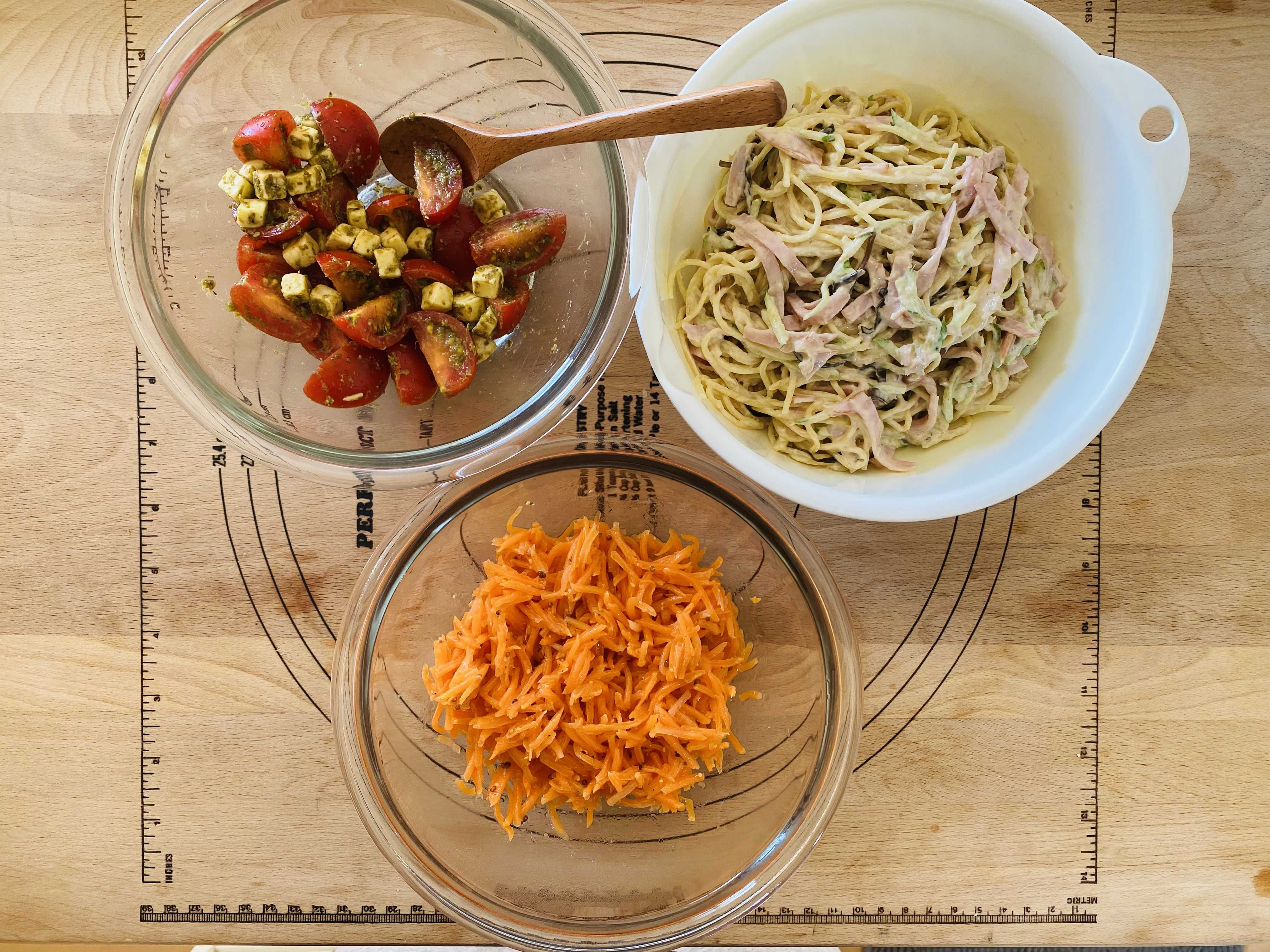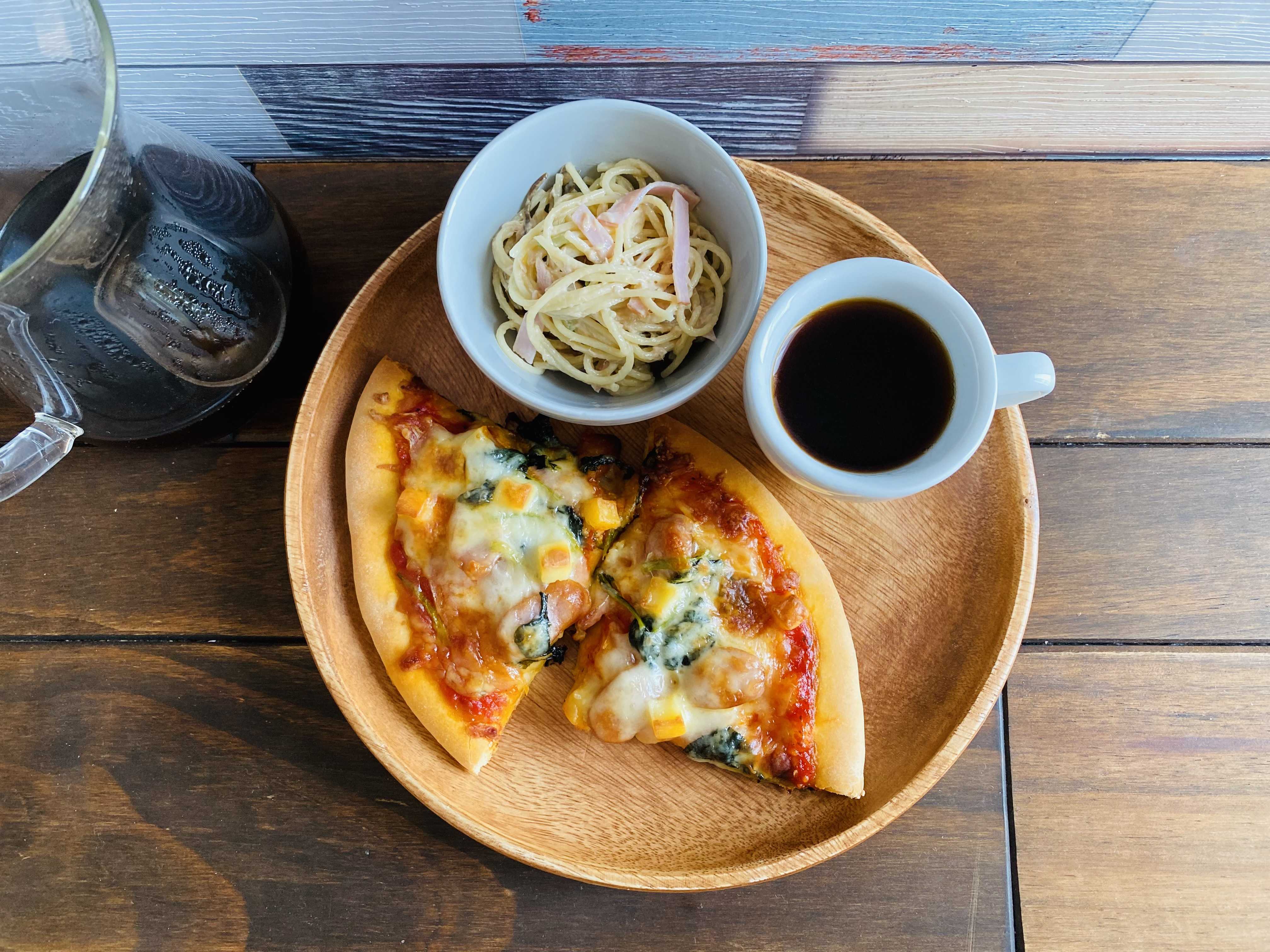 それでは、このあとのお届けは今日の盛りだくさんのcookingから一旦、「本日のおひとりランチ」のもようです今日のラインナップはできあがったばかりの「サラダスパ」と昨日の「ピザ」となりますッほんとであれば「サラダスパ」は明日のモーニング用なんですがちょっとだけ味見してみることにしましたおっ、ツナが良い感じにパスタと絡みあってほかの塩昆布とハムときゅうりの具材たちがほどよくアクセントになってる感じですねちょこっとそえると良いはたらきしそうですね今日はこんな感じでおひとりランチ完成です