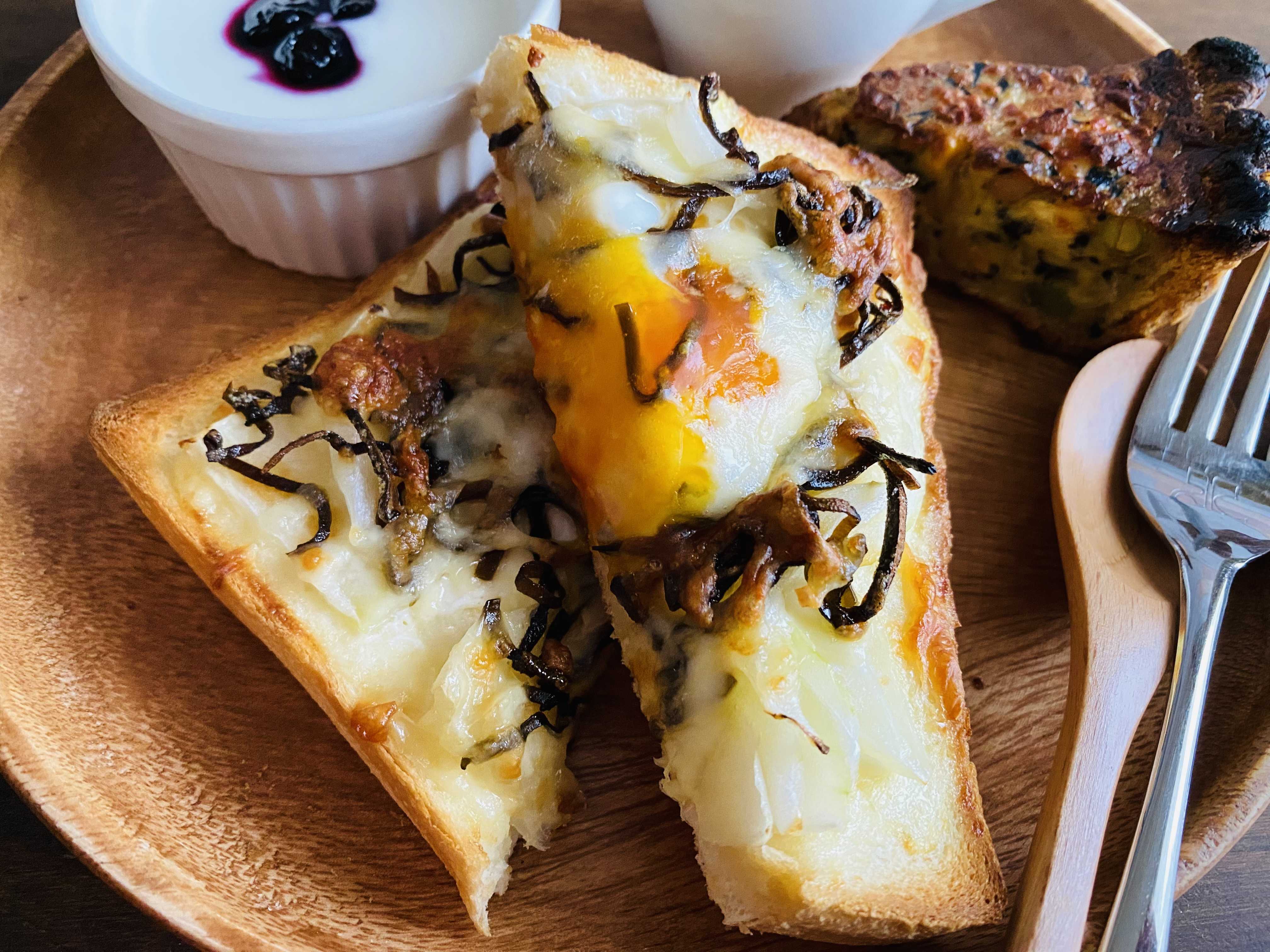 それでは、cooking最後のお届けは「本日のおひとりランチ」のもようです今日のラインナップは「塩昆布のピザ風トースト」とのこりものの「キッシュ」「自家製ブルーベリーのヨーグルト」「コーヒー」といった感じです「塩昆布のピザ風トースト」は冷蔵庫にちょうど使いかけの「塩昆布」が出番待ちしている状態だったのでなにかに使えないかなぁってことでトーストにしてみることにしました ※「スライスたまねぎ」と「たまご」入り ↓仕上りの塩味がどうかなぁって思いましたがちょうど良いバランスで思いのほかおいしかったです今日はこんな感じでおひとりランチ完成です