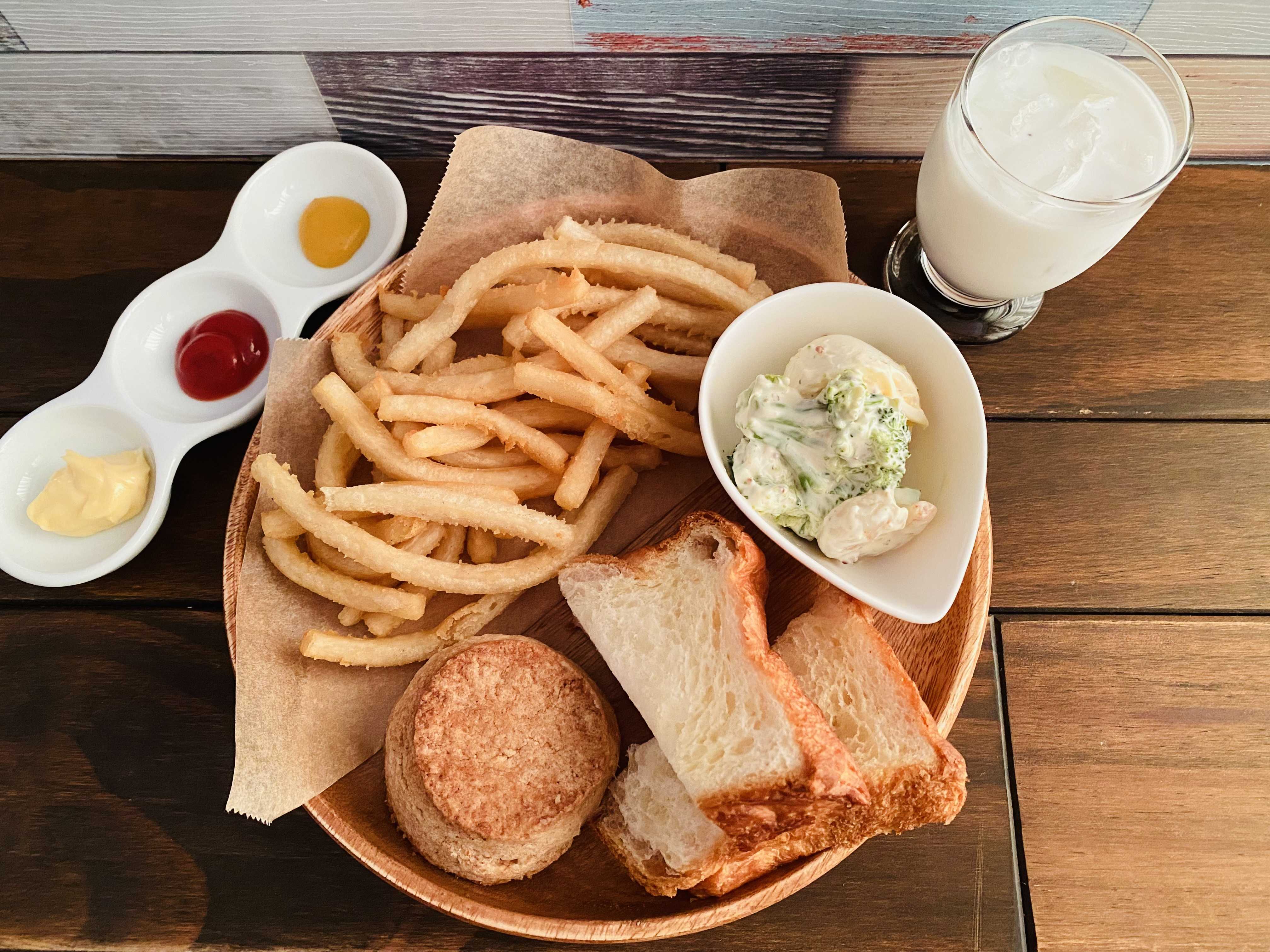それではcooking最後のお届けは「本日のおひとりランチ」のもようですなんだか盛りだくさんになっちゃいました!なんといっても今日は「ラスポテト」ですねひさしぶりでおいしかったですあと、先につくってあった「えび & ブロッコリー & ゆでたまごのサラダ」を夕飯前にちょっとだけ味見のためにそえたりして「昨日つくったスコーン」「デニッシュパン」「ブルーベリーミルク」をラインナップさせて今日はこんな感じにしてみましたこれで今日のまんぷくおひとりランチ完成です