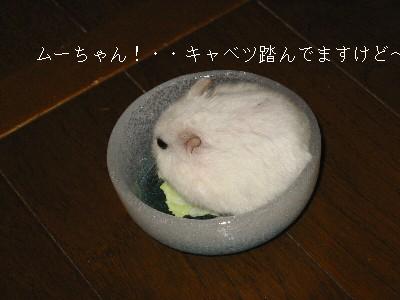 まあるいエサ箱に、ぼたもち見たいなムーちゃん!どっちもまんまる・・ 頭をなで様と手を近づけると、クルッとお尻を向けるの・・・・・・・キャベツ取らないって!今年の夏も無事に乗り切れそうだね。暑くなり出した頃、エサ食べなくなって心配したけど良かった・・・楽天のブログにも、ハムスター買っている人沢山いる。毎日写真載せて・・ハムちゃんブログにしてる人や・・私の様に時々登場させてる人もいる。どの写真のハムちゃんもとてもかわいい・・今日の○○くんや××ちゃんは、元気かな?・・な~んて見に行ったりしてけっこう楽しんでる・・ おまいら~ありがとう! ・・・・ってテレビ見すぎ・・