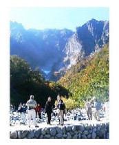 に紅葉見物に行ってきました。日頃の行いの良さからか、前日迄の雨模様から一転して絶好の秋晴れでした。紅葉シーズンの為、平日にも係わらず観光客で賑わっており、展望台に昇るロープウェイとリフトは長蛇の列でした。肝心の紅葉は長引く暑さと10月の長雨の為かイマイチで少し残念でしたが、見晴らしの良い景色と木々に囲まれ最高の気分でした。左の写真は 「一ノ倉沢」