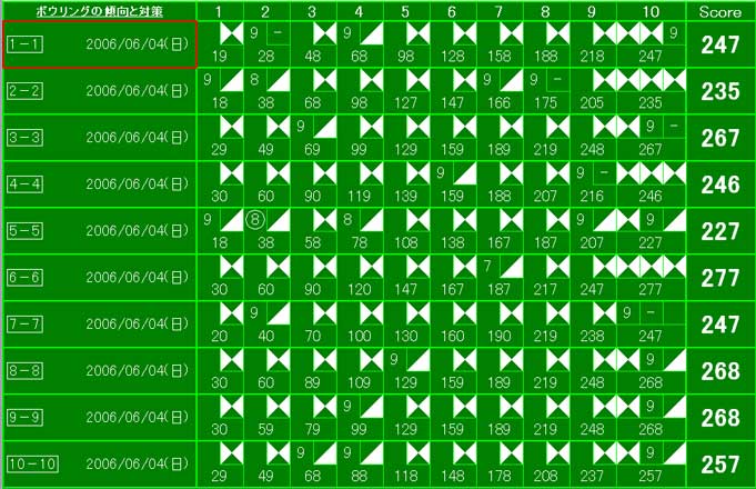 あけましておめでとうございます(遅っ)いろいろ御連絡いただいているのですが忙しくて対応できておりませんでした・・・ごめんなさい。去年、Nの全日本で競技ボウラーを引退しましたが仕事柄・・・投げることがありますといいつつもう2ヶ月なげてませんでした^^;でも、急遽なげることになったんでブログも更新しようかななんて思いました。しかし、楽天ブログ・・・・使いにくくなりましたね。。。なので字だけで書き連ねますね。前半~ 204 279 245 728後半~ 259 228 238 725合計~ 1453(242.16アベ)ほんとに、ほんとに去年の11月からボールにさわってませんでした・・・けどあんがいスコアになりますね^^;指はぬけませんでした・・・・でもあれですね。ラインっていうのを探すのは長い期間なげてなくてもそんなに損なわれないようです。外からさぐって・・・・だめだ・・・すこしウチへ・・・ああよさそう・・って感じですね。最終的にスパット12枚くらいからフッキングを37フィート付近で8枚くらいにしたラインがおいしかったですね。すると多少の失投はポケットに集束されるかんじでした。ボールはSR300。当然のごとく引退者なので新しいボールは買ってません・・・てか、わかりません^^;みなさんは、楽しいボウリングライフでしょうか?楽しい!うれしい!すこし悩む・・・んでスコアアップ!のボウリングライフが、みなさまにおとずれることを祈って・・・・今回の更新は、ここまで♪では、またの機会まで・・・ごきげんよう♪