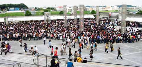 東ゲート側、先ほど始まりました。行列はテント前で4回ぐらい折れて、階段上まで続いていますが、神戸ほどではありません。西側の売場は販売開始が1時間遅れですが、横に7~8人の列で50m強ぐらい並んでいました。今は曇っています。