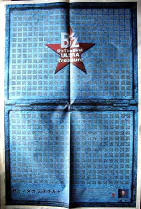 今日の読売新聞朝刊に、「B'z The Best “ULTRA Treasure”」 の広告が載っています。今までは、真ん中の見開き全面、2ページ広告でしたが、今回はさらにその両面。つまり、4ページ広告です。 真ん中のページの見開きは縦。小さい四角はQRコードで、全部で600個近くありますが、その中から、35個の当たりQRコードを見つけると、B'zの超お宝コンテンツがもらえるそうです。応募期間は載っていません。外側を開いたところ。折った状態はこんな感じ。重厚感のある印刷です。手に入れられなかった方は、読売新聞、もしくはお近くの販売店に問い合わせてみてください。「B'z The Best “ULTRA Pleasure”」 の、発売日6月18日の全面広告は朝日新聞だけでしたが、6月27日の読売新聞にも、「B'zサプリ」 の写真を使った全面広告が載りました。ですから来週辺り、また違う全面広告が載る可能性もありますね。