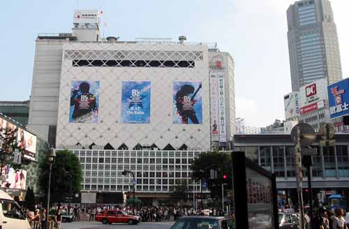 JR渋谷駅真上にある、東京東横店の壁の大看板がB'zになっています。18時54分頃からの、NHK関東地方の天気予報 (「首都圏ネットワーク」 内) は、たいてい、渋谷駅前のスクランブル交差点をTSUTAYA側から撮った映像で始まります。角度的に画面に入らないことも多いですが、映る可能性もゼロではありません。見られる地域の方はチェックしてみて下さい。後ほど、実物の写真をアップします。