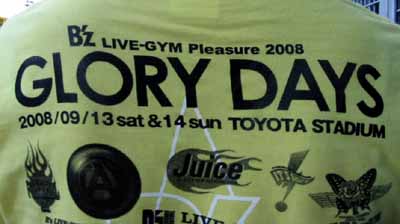 ネタバレはありません。B'z LIVE-GYM Pleasure 2008 -GLORY DAYS-、神戸・豊田両公演の、グッズ販売、規制退場などについてまとめてみました。【グッズ】神戸では、13時販売開始。ツアーTシャツの限定版は、早い日で黄色が13時半、黒も14時頃完売。通常版や、ステージタオルも15時には完売。行列時間は、昼過ぎに並んだ場合で1時間弱、16時過ぎても1時間半以上。豊田初日は、販売開始が14時40分頃。ツアーTシャツの限定版に、神戸と同じ誤表記があったため、どう対応するかで遅れたようです。誤字のままでいい場合は、その場で購入可能。正しい表記のものが欲しければ、グッズ販売テントの一番会場寄りの位置で、後日の郵送を申し込む。販売開始が遅れた割には、神戸ほど時間はかからず、16時前に並んだ友人も1時間ほどで買えました。2日目は、駅に近い2ゲート売場が13時、反対側の7ゲート売場は14時開始。7ゲートの方が空いていましたが、どちらの売場も、販売開始直後がもっとも混雑し、時間がたつにつれて行列は短くなっていきました。15時頃には行列はほとんどなく、売場のカウンター前で順番を待つ程度。この日は、ツアーTシャツ限定版の、正しい表記の製品の郵送申し込みブースはありませんでした。2日目、ツアーTシャツの売れ具合は、売場に小さなボードが掲げられて、そこに手書きで表示されました。限定版の黒が15時過ぎに全サイズ完売。16時過ぎ、黄色も、限定版はXS以外完売。通常版も、黒はサイズによっては売り切れ。神戸では黄色、豊田では黒の方が人気が高かったようです。神戸で行列が長くなったのは、ツアー最初の地であることと、グッズ売場のテントが1ヵ所しかなかったことが大きいと思います。2ヵ所あった豊田では、行列は大きく緩和されました。日産でも、メインスタンド側とバックスタンド側の、少なくとも2ヵ所はあるはずです。新横浜から来る方が多いので、バックスタンド側の売場の方が、混雑の度合いが高いと思われます。その場合は、反対側に回ってみてください。ツアーTシャツ限定版。通常版は、「GLORY DAYS」 の下の行がありません。【リハーサル】13時55分には始まっていました。アリーナ公演では、開演時間のだいたい3時間前でしたが、カラオケGYMなどがあるためか、それより1時間ほど早くスタート。長さは約50分ほど。屋根がないおかけで、本当によく聞こえます。【規制退場】アリーナ席は両会場とも後ろから。神戸では、一番最後の席が退場できたのは、終演 (21時頃) 後1時間以上たってから。豊田では、スタンド席は、終演直後にほぼ一斉に退場。アリーナ席もそれほど時間はかかっていなかったと思います。両会場の違いは、駅までの距離、公共交通機関の選択肢があるかないか、道の状況などが理由だと思います。豊田市駅からスタジアムまでは、車道より歩道の方が広い。そのおかげで、歩道の渋滞も大したことはありませんでした。雨が降っても♪これから書くことは間違いの可能性があります。読んでくださる方は、それを念頭に置いてお願いします。神戸2日目に、-GLORY DAYS-のツアーロゴが背中に印刷された、白いポンチョを着ている人を見かけました。突然の雷雨があった日です。その後、「B'z Partyブースで販売していたポンチョは売り切れました」 というアナウンスがありました。着ていた方が自作したのかと思っていたので、販売していたことに驚きました。でも、見かけたのは、その1人だけ。その後、どこからもそんな話は聞こえてきません。そこで豊田で、ビーパのブースに行って確認したところ、「雨が降らないと販売しない」 という答え。「今、ここにある」 とも言っていました。「やっぱりあったんだ!」 と思いましたが、イマイチ確信が持てません。友人は、「GLORY DAYSのロゴのポンチョ」 と私は言っていたし、スタッフの方もそのニュアンスで話していたと言ってくれましたが、あちらは単に 「ポンチョ」 ということだけで、受け答えしていた可能性もあります。でも、本当に-GLORY DAYS- のポンチョがある可能性もなくはありません。それは、雨が降らないと分からないし、買うこともできません。台風13号が接近して、雨を心配されている方も多いでしょう。-GLORY DAYS-のポンチョがあるかもしれないと思えば、雨もまた、多少楽しみになるんじゃないでしょうか。台風のまま来るのは勘弁してほしいですが。ただ最初に言ったように、この話は何らかの間違いかもしれません。ブースに買いに行ったら、出てきたのは “GREEN”ツアーのポンチョだった、ってことになるかもしれないので、信じ込まないでくださいm(__)m