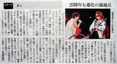 【記事の掲載日について追記しました】昨日29日の、読売新聞と朝日新聞それぞれの夕刊に、B'zのライブに関する評が載っていました。[評] B'zが公演 20周年 ロックへの情熱全開 YOMIURI ONLINE(読売新聞)http://www.yomiuri.co.jp/entertainment/music/news/20080925et03.htm紙面には、白黒写真があったそうです。そして朝日新聞。こちらはネットで発見できなかったので、写真でどうぞ。携帯の方は、小さすぎて読めないでしょうねm(__)m【追記】読売新聞は、25日夕刊と、29日朝刊に掲載。地域によって掲載日が違ったようです。