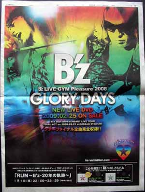 今日の朝日新聞朝刊、18面に、「B'z LIVE-GYM Pleasure 2008 -GLORY DAYS-」 の全面広告が載っていました。 NHKBSのお正月特番、「RUN ~B'z・20年の軌跡~」 も紹介されてますね。NHKでの予告も、これから本格化しそうです。「B'z The Best “ULTRA Pleasure”」 のところに付いている黄色のマークには、「いつかのメリークリスマス収録」 と書いてあります(^^)