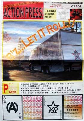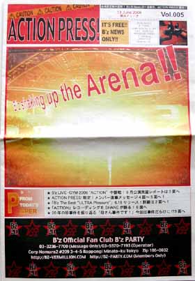 『ACTION PRESS! Vol.004』5/4 長野ビッグハット ~ 5/31 サンドーム福井 ★ B'z LIVE-GYM 2008 “ACTION” アリーナツアー4月よりスタート! アリーナ公演楽屋レポート★ ACTION PRESS! 限定!メンバー直筆メッセージ★ 思わぬ裏ネタが聞ける、益田さんのコーナー 「素晴らしきサポ人生」★ アリーナツアーより大田さん参戦! 「男どあほうハイトーン」〈B'z FAQ チーフマネージャーへの質問〉 抜粋 (原文のまま)Q. 毎年ツアーが楽しみ! でもツアーに来ない県もありますね。 開催地はどうやって決めているのですか?A. ツアー毎に全県に行く事はまず不可能です ツアーを行える期間、どれくらいの規模のツアーにするか、コンサートを行える会場の有無。 様々な問題をクリアしていき、ツアー開催地は決定していきます。Q. MEET & GREETはどうやって抽選しているのですか?A. コンサート開催会場になるべく近くに在住の会員の中から、継続年数などに偏りがないように抽選しています。 尚、一度当選された方は対象会員者の当選が一巡しない限り、再度当選する事はありません。Q. 頼むから、これだけは止めてー!と、B'z FANに対して強く望むことは?A. 自分がやられて嫌な事を他人にするのはやめましょう。Q. 15周年の時にリマスタリングで8センチシングルがマキシシングルとなってリリースされましたが、その続編はリリースされないのでしょうか?A. リリースしたいと思っていますが現在予定はありません。Q. Z'bの再結成はないのでしょうか?A. Z'bのメンバーがその気になってくれれば……。Q. これまで20年間に行ったツアーで一番過酷だったツアーは何のツアーですか?A. 過酷の種類は様々ですが毎ツアー過酷です。 その中でも、天候等の自然との闘いは、振り返っても過酷さが鮮明に思い出せます。〈Shane Gaalaas's One Point English Lesson〉 抜粋 (原文のまま)Q. ライブ中にドラムがクールだと伝えたい時にどのように言えばいい?The drummer rules!Q. ドラマーに対して声をかけたいなら…「(ドラマーの名前)、you rule!」Q. 頑張らないでいつも通りでいいんだよ!Don't worry about it, just be yourself!〈増田隆宜 我が素晴らしきサポ人生〉 抜粋 (原文のまま)『1999』'98年のSURVIVEツアーではサポートメンバーが一新されて僕は不参加でしたが、翌年のこのツアーで大復活(^^)v。しかし僕以外のメンツは若手 (ドラム:黒瀬蛙一/ペース:満園庄太郎) になり、それまでサポートメンバー中最年少だったのが一躍バンド最長老に (-_-;)。黒瀬&満園を呼びつけては先輩風吹かせてリズム特訓させたり酒飲んで説教したりしてたら、いつしかそれが 『増田塾』 と呼ばれるようになりました。今も楽屋での稲葉クンの発声練習のケアなどが増田塾と呼ばれたりするので、ファンレターなどでも 『増田塾に入塾したい』 という方がいますが、実態は 『クドいオヤジの説教』 ですからやめといた方がいいです。ともあれあの黒瀬・満園コンビには楽しませてもらいました。名曲 『Brotherhood』 の歌詞で号泣、粗相してスタッフに怒られて号泣、とよく泣いてましたっけ。 まさに 『黒い青春』 に出てくる 『やんちゃな日々』 を地で行くアツいヤツらでしたねぇ。見開きページ松本さんメッセージ稲葉さんメッセージ