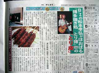 今日の夕刊紙 『日刊ゲンダイ』 の、「タレントが通う店 やってる店」 というコーナーに、松本さん行きつけの焼き鳥屋さんの記事が載っています。14面です。テレビ朝日系ワイドスクランブルの、夕刊キャッチアップのコーナーで紹介されました。紙面には松本さんの写真も載っています。稲葉さんと一緒に訪れたこともあるそうです。番組ではバックに、「裸足の女神」 が流れていました。コンビニ2軒に行きましたが、まだありませんでした。金曜は競馬新聞と一緒なのでいつもより来るのが遅いうえ (そうなんだ)、天気が悪いので余計遅れそうだということです。手に入ったら、改めてご紹介します。サイトにもそのうちアップされると思うので、そちらも見つけ次第ご報告します。