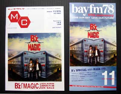 ◆TSUTAYAのフリーペーパー、『VA』。記事はありませんが、左からの12ページに 「MAGIC」 の広告。◆『MC (ミューズクリップ)』 と、『bayfm78』。 『MC』 は初めて目に止まったんですが、発行はレコード新聞社。発行日は10日と25日となっています。ちなみにこの号が 「11月10日発行・11/25」 の号 (NO.887) です。大きさはA5 (縦21×横14.9cm) で、約30ページ。『bayfm78』 はbayfmのスケジュール表のようなもので、製本ではなく、じゃばら状に5つ折りになっています。裏表紙に小さくアルバム紹介、その前に伊藤政則さんの一文が載っています。大きさは、縦22×横11.8cm。どちらもタワーレコード渋谷店で見つけました。◆『BURRN!』 12月号表紙・巻頭インタビューはスラッシュ。 (スラッシュの表紙写真をクリックしてください)稲葉さんについても語られています。コーシはプロ中のプロだった。 ~中略~シンプル。 イージー。 苦労知らずの経験だった。 (誌面より抜粋)そのほかに、稲葉さんに曲を送ったら、「もの凄くカッコいいメロディを付けてくれた」 とあるんですが、歌メロは稲葉さんが付けたということなんでしょうかね。作曲のクレジットはどうなってるんだろうと検索してみたら、こんなページを発見。http://www.neowing.co.jp/track_for_cdj.html?KEY=UICV-5006英文の説明を書いた人、矛盾に全く気付いてないようですね(^_^;)英語ができなくても分かりますよ。また、24ページに 「SAHARA~feat. 稲葉浩志」 の広告も載っています。ところで渋谷タワレコ。店頭にあった 「MAGIC」 のポスターに 「入荷済み」 と書かれた小さな紙が貼ってあったんですけど、いいんですかね、そんな内部情報流しちゃって(^_^;)しかし、こんなに早く入荷してるんですね。タワレコ辺りだと入荷数も相当多いでしょうから、一般的な店舗より早く来るのかもしれませんが。