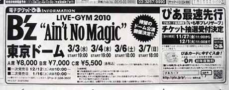 『月刊ローソンチケット LIVE版』 12月号 vol.28B'zが表紙です。ニューアルバムとLIVE-GYM 2010に関する巻頭記事2ページ。ドーム公演のプレイガイド最速先行発売の案内。小さいですが、SHOWCASE 2009の写真も3枚載っています。ローソン店内で無料で配布されています。B'z LIVE-GYM 2010 “Ain't No Magic”プレイガイド最速先行発売11/17(火)20:00~11/18(水)23:00 ・ ローチケ会員登録が必要 (無料) ・ 先着順 (抽選ではありません) ・ 受付はWebのみ福岡 Lコード 82222名古屋 Lコード 48370 大阪 Lコード 58178 東京 Lコード 75011ローソンの先行手数料ってけっこう高いですが、今回はいくらでしょう。ただ抽選ではないので、先行手数料がかからない可能性も考えられなくはありません。どちらもしても、システム利用料は取られますが。16日はビーパの結果発表。17日はアルバム入荷日。そして夜は先行発売受付開始。忙しくなりますね。
