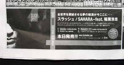 11日(水)の朝日新聞朝刊に 「SAHARA~feat. 稲葉浩志」 の広告が載っていました。テレビ欄の内側の一番下、幅はページの半分。白黒になると、稲葉さん、ほとんど亡霊です(^^;)深夜にはCMも流れていると聞き、音楽に関係ありそうな番組を片っ端から録画予約してみたら、引っかかりました!「FutureTracks→R」 (テレビ朝日、HTB) という番組の中で流れました。 (15秒)動画ではなく、ジャケットの静止画が映るだけですが、稲葉さんの部分もかなりアップになります。「全世界を震撼させる…」 というキャッチコピーが、ナレーションとテロップにも使われていました。それから、今日始まった 「走魂 (そうこん)」 (日本テレビ) という、NEWSのメンバーがひたから走るという番組内で、ツアーの、ローチケ先行予約のCMが流れました。 (30秒)映像は 「イチブトゼンブ」 ですが、ツアーロゴがバーンと出るのが新鮮です(^^)この番組は、開始直前と終了直後に、別々の 「MAGIC」 のCMも流れていました。「MAGIC」 のCMは、深夜にかなり流れていますね。スポットなので、どこで流れるか分かりませんが、音楽関連の番組周辺に網を張っておけば捕まえられそうです。また、昨日ご紹介した 「クマグス」 と同じ時間帯に、bayfm特番でB'zとのトークを繰り広げた伊藤政則さんの、「ROCK CITY」 (tvk 24:45~) という番組をやっています。興味を持たれた方はちょっとのぞいてみてください。