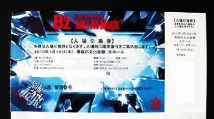 BZ-PARTY.COM 更新B'z LIVE-GYM 2010 “Ain't No Magic” 1月14日 青森市文化会館 1月15日 大館市民文化会館 1月17日 仙台サンプラザホール 1月19日 福島県文化センター上記公演のチケット発送を、12/22(火)に完了したそうです。各公演日の2週間前になってもチケットが届かない場合のみB'zチケットセンター 03-6746-0576 (平日11:00~18:00)まで、早めにお問い合わせください。そして、25日付けで STAFF DIARY もアップされました。2010年から、様々なことが変わります。もちろん、チケットの券売システムに限ったことではありません!それは実際にご自身でLIVE-GYMを体感して頂ければ、きっとお分かり頂けると思います。B'zと皆様が、共に素晴らしい“MAGIC”を起こす…そんな瞬間が、もう間もなく訪れようとしています。 (サイトより抜粋)LIVE-GYMで体感できる変化?ともに素晴らしい “MAGIC” を起こす?いったいなんでしょう。 想像がつきません。また、1月発送の会報では、「ちょっとしたお知らせ等もある」 そうです。「大きくは期待しないで下さい」 とのことですが (^^ゞ