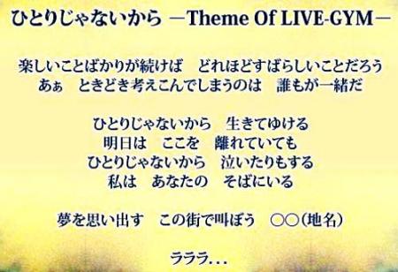 B'z OFFICIAL WEBSITE 更新LIVE-GYMのテーマ曲ができたそうです。原文のままご紹介します。B'z LIVE-GYM 2010 "Ain't No Magic"に参加されるお客様へこのたびB'zの2人がLIVE-GYMのテーマ曲を制作しました。つきましては、この企画のために書き下ろされた楽曲を公開致します。末永く愛されるLIVE-GYMのテーマ曲にするために、みんなでこの曲を育てていきましょう!会場でメロディを耳にされたら、是非一緒に歌ってみてください。なんだか無邪気な感じの曲です(^^;)子どもでも覚えられるように、ということかな。「あいかわらずなボクら」 に雰囲気が似てるかもしれません。最後の 「○○(地名)」 の部分は、ライブ会場ごとに付け替えるんでしょうか。電話情報にはアップされていませんし、歌詞をそのまま書くわけにはいかないので、携帯の方のために歌詞の画像を付けておきます。小さくて見えないかもしれませんがm(__)m「オフィシャルサイトの画面が真っ白」 と書きましたが、どうやら私のパソコンだけだったようですm(__)mいつも使っているパソコンでは、ビーパは見られるけど、今もオフィシャルは見られません。キャッシュのクリアもしてみたんですが改善しません。原因や対処方法のの分かる方いらしたら、ぜひ教えてください。
