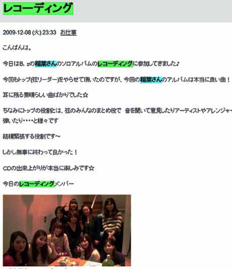 松本さんのソロ活動情報は、28日にラリー・カールトン側から発表された文章(PDF) が掲示板で紹介されていました。松本さんのプロフィールが詳しく書かれていますが、これからの活動についてはB'zのオフィシャルで発表された以上のことは分かりません。稲葉さんのソロ活動については、昨年、スティーヴィー・サラスとバイオリニスト・林こずえさんのサイトでにレコーディングについて書かれていたため、「ソロアルバムを作っていることは間違いない」 とちょっとした騒ぎになりました。どちらの書き込みも間もなく削除されてしまいましたが、その痕跡?をご紹介します。Stevie Update November 15, 2009 Facebook「ALSO in between all this the mighty koshi ianaba from the japan super group bz flew to LA and we recorded 6 new tracks for his solo cd and his new stuff is on point!!」これは、スティーヴィーの文章を引用したファンのサイトのキャッシュ (履歴みたいなもの)です。(スティーヴィーのサイトの 「NEWS」 の部分はキャッシュが残りません)この時点で、スティーヴィーと6曲つくっていたわけですね。レコーディング - 林こずえのバイオリン教室@東京 2009.12.8「今日はB,zの稲葉さんのソロアルバムのレコーディングに参加してきました♪今回もトップ (弦リーダー) をやらせて頂いたのですが、今回の稲葉さんのアルバムは本当に良い曲!!耳に残る素晴らしい曲ばかりでした」こちらは林こずえさんのブログそのもののキャッシュですが、携帯サイトのものです。パソコン用サイトのキャッシュはもう残っていないようなので、画像でご覧ください。※字が読みやすいように画質を変えてあります。 「アレンジャー」 より右の部分は稲葉さんに直接関係ないのでカットしました。この曲が 「この手をとって走り出して」 の可能性もありますね。そして、これも掲示板で教えてもらった情報。K-1 OFFICIAL WEBSITE で、B'zのある曲が流れています。 (新曲ではありません)「3/27 MAX & 4.3 WGP:二大イベントスポットCM」 の右の方。「WORLD GP 2010 IN YOKOHAMA」 の 「Trailer」 に入ってください。「NEWS23クロス」、エンディングで稲葉さんのレコーディング中の映像を流してくれました。万が一コメントでも流れたらと思って (そんなわけないんですけど) 録画していたんです。B'z OFFICIAL WEBSITE のものよりは短いですが、ラッキーでした(^^)v番組公式ページにテーマソング情報はまだありません。このまま載せないんでしょうか。