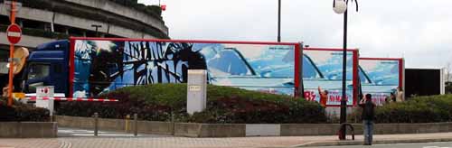 Yahoo!ドームのツアートラック。まずこんな風に目に入って来ます。後に回り込んで反対側から駐車場に入りました。手前の2台 (実は間にもう1台います) は無地で、504と833。 504というナンバーは初めて見ました。“GREEN” ツアーで54はありました。 そして833、以前はこうでした。 今回ラッピングされている、111、178、69。