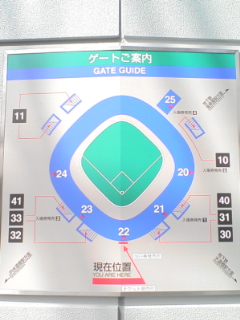 写真は東京ドームのゲート案内板です。 後楽園駅から来ると25ゲート前に、水道橋駅から来ると22ゲート前に出ます。 大阪ドームのチケットにはゲート番号が入っていましたが、SS以外はそれが座席の最寄りゲートではありませんでした。 それどころか、入場してから半周近く歩かされることもありました。 東京もゲート番号が入っていますが、同様だと思います。 退場も、規制退場があるのでどこに出られるか分かりません。