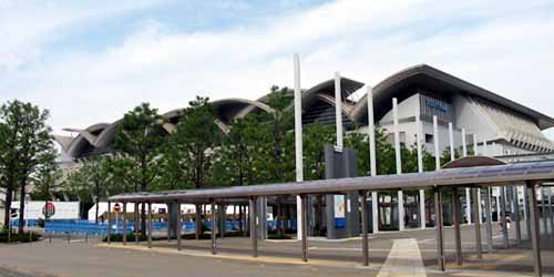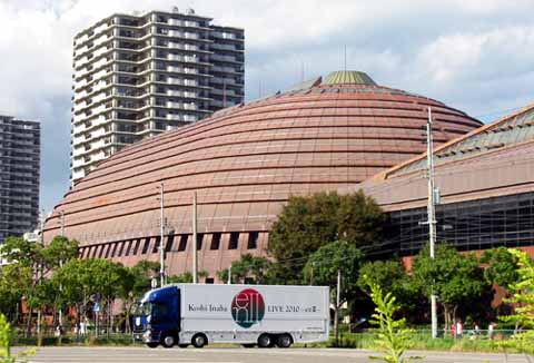 鹿児島アリーナ敷地内には石の門が立っています。 石門の向こう側、左奥がメインアリーナ、写真右端はサブアリーナです。手前には川が流れていて、この写真は橋のたもとから撮りました。 石門 この写真は、ライブ前日の10/14です。その時もご紹介しましたが、前日には石門の手前に、関係者への駐車場の案内板が立ててありました。 (ライブ当日はありませんでした) 右の案内板、歩き出しそうな気がしてしょうがありません(笑)その案内板を超えて近づいたところ。 反対側。 つまりメインアリーナ側から見たところ。 手前のくぼんでいるところは噴水池。白い四角は、石門の説明板です。 この石門は、旧鹿児島刑務所の正門として明治41年に建築されました。刑務所の移転に際し、市民からの要望もあり、保存のためここに移設されたそうです。「設計者/山下啓次郎」 とありますが、この方はジャズピアニスト、山下洋輔さんのおじいさんだそうです。千葉刑務所は、何度かドラマの舞台として使われていました。なんて素敵な建物だううと思って見ていました。鹿児島アリーナの石門も、登録有形文化財にも指定されている素晴らしいものです。鹿児島アリーナのホームページにも写真を載せればいいのにと思います。そして、鹿児島アリーナ (メインアリーナ) 入口。 グッズ販売もガチャガチャも、右から2番目の入口を入った中で行われました。狭い上、グッズもガチャガチャも同じ列で並ぶので、開演間近になっても長い列が残っていました。販売開始時間を遅らせた影響もあったかもしれません。左の2つは入退場用。右端の入口からは開場前、サブアリーナとの連絡部分に自由に出入りできました。 (休憩スペースやトイレ、自販機などがあります)ツアートラック。写真が撮れるようになっていたのは 178 と 504 だけ。69 は 504 の隣にありますが、2292 は左奥の方に置いてありました。 ラッピングされているのは4台だけですが、トラックは全部で22台ぐらいありました。次の会場へ移動する時は、一斉に出発するんでしょうか。だとしたら見てみたいです。 壮観でしょうね(*^_^*)それとも、荷物を積み終わった順番にバラバラにスタートかな?