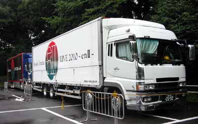 神戸ワールド記念ホールと 178正面の丸い屋根がワールド記念ホールです。なんだか、チャーハンを作る時の型みたい(^_^;)手前右は、ポートアイランドスポーツセンター。そのポートアイランドスポーツセンターをバックにするとこんな感じ。こちらは 69。 駐車場の奥の方に止められていて、向こう側にポートアイランドスポーツセンターの屋根が見えています…、というより 「生えてます」 って感じ。今度は、まるで魚の尾びれみたいですね(^^;)初日は 178 も 69 と同じように置かれていました。でも2日目になって、最初の写真の位置に移動されていました。初日もあの位置は空いていたんですけど、出すのを忘れていたんでしょうか。504 と 2292 は見つかりませんでした。ほかにもトラックはたくさんあったので、ナンバーが確認できないところに置いてあったのかもしれません。 この写真を見て初めて気が付いたんですが、この 69 にだけ、VERMILLION のマークが付いています。荷台後方の左上と、右のテールランプの下にもあります。 ほかのトラックと比べてみてください。 2292 の荷台上部にも何か付いていますが、VERMILLIONマークではありません。↓で見ると少し分かりやすいです。大阪で撮った、左が 2292、右が 69です。 では、以前のツアートラックはどうだったんだろうと思って確認してみたら、2008年は 69 ではなく、178 の方にマークがありました。 ただ、この時の 178 と、今年の 178 は、車種が違います。車を変えたのでナンバーも取り直しになったようで、この写真では分かりにくいですが、ひらがなの部分が2008年は 「い」、今年は 「う」 です。なぜVERMILLIONマークを 178 から 69 にしたのか。それは関係者じゃないと分かりませんね。右テールランプ下のマークは、2008年の 69 にも付いていました。