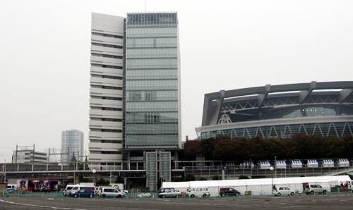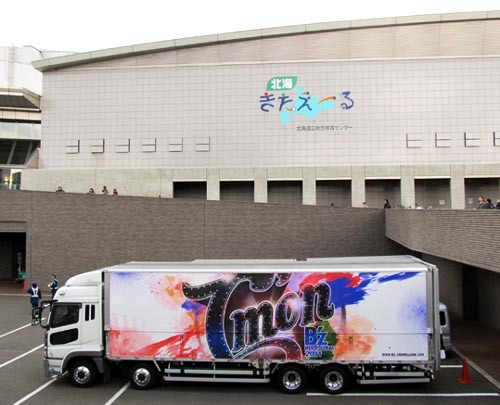 B'z LIVE-GYM 2011 -C'mon- 写真でライブレポート11/3、5、6 さいたまスーパーアリーナ「さいたま 1」 はこちらさいたまスーパーアリーナ(右後方)と、グッズ売場(右下の白いテント)と、ツアートラック(左下の端)ツアートラックは、グッズ売場のあった駐車場の端に止めてありました。位置は3日間同じでしたが、配置は毎日変わり、初日と2日目は2台だけでしたが、最終日は3台出ていました。11/3 833 と 白17811/5 833 と 白17811/6 833 と 白・黒178