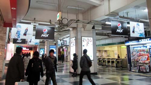 渋谷駅構内に掲示されている、ペプシネックスのB'zの広告です。ポスターがあるのは、東急東横店2階、JR山手線・玉川改札前です。去年はツーショット写真がそのまま使われていましたが、今年は別々。しかも白いので、インパクトという点では去年の方がすごかったような気がします。東急東横線車内の中吊り広告つり革のバーが前にない位置でよかったです。山手線の方は、すぐ前をバーが横切っていて、バーを入れないようにしようとすると、かなり下から撮らなければならないような位置にありました。