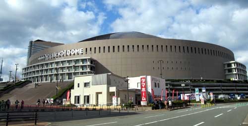 B'z LIVE-GYM 2011 -C'mon- 写真でライブレポート12/04 福岡 Yahoo! JAPAN ドーム「福岡 1」 はこちら6ゲート前にある立体手型福岡ドーム公演の前にもご紹介しましたが、いちばん右の青が松本さん、左隣の白が稲葉さんです。この手型と握手しに来るファン、13時頃はちらほらでしたが13時半近くなると行列ができ14時近くなると長くなりすぎて、列の方向を変えざるをえないほどでした。ファンのおかげで、お二人の手型はいつもピカピカです。地上エリアでは、映画 「怪物くん」 のイベントが行われていました。右隣の、壁にギターがついている建物はハードロックカフェ。こちらにも長蛇の列ができていました。トラックの中には、映画の一場面の写真を額に納めたものが何枚か展示されていました。「怪物くん」 ファンだけでなく、B'zファンも一緒に記念撮影。「怪物くん」 イベントの左隣はZEPP FUKUOKA。こちらでは 「九州限定アイドル」 のイベントが行われていました。この日は福岡国際マラソンの日でもありました。福岡ドーム最寄りの地下鉄・唐人町(とうじんまち)駅に着いたのが12時過ぎ。マラソンは、一駅しか離れていない大濠(おおほり)公園を12時10分スタート。めったにない機会なので、先頭集団が来るのを待ってみました。そして、やって来ました!ただ、残念ながら先頭集団の写真は撮れませんでした。道路の反対側にいたため、先頭集団が来たちょうどその時、こちら側を車が通って遮られてしまったんです(; ;)