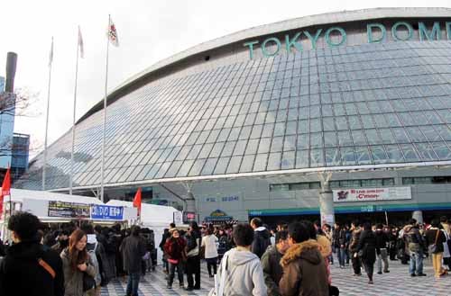 B'z LIVE-GYM 2011 -C'mon- 写真でライブレポート12/22、24、25 東京ドームグッズ売場側から見た22ゲート方向左のテントは手前がCD売場、奥がB'z PARTY受付です。この写真の手前にグッズ売場、右にガチャガチャ売場があったので、22ゲート前は時間が進むにつれ、待ち合わせの人、グッズを買い終わった人、ガチャガチャを交換しようとする人などでかなり混雑しました。-C'mon- 横断幕最終日のグッズ売場 14時過ぎ 行列はまだありません。15時過ぎ いつの間にか長蛇の列になっていました。最終日は、初日、2日目よりグッズ売場の混雑が激しかったようです。天気も、14時過ぎまではよかったのですが、その後、急速に雲が広がりました。「やっぱり」、とみんな思ったかもしれません。最終日のガチャガチャ行列右奥の白い看板(オレンジと緑の看板の左)が最後尾です。この後まもなく、売場への入場規制が始まりました。専用コインへの引き換えは、カプセルの残り数を細かくチェックしながら数人ずつ行われ、専用コインへの引き換えができた人のみ、売場に入ることができました。「販売終了」 となっていますが、この時点ではまだほんのわずかの人数ずつですが、専用コインへの引き換えが行われていました。「東京ドームシティ内でのアイテムの交換や転売などは絶対にお止め下さい」 とあるように、初日から警備員が交換・転売禁止を叫んでいました。ただ、最終日のある警備の人は、「見えないところでやってください。 見えたら注意しなきゃいけないから」 と、こっそり言ってました。融通の利く方です(^^)完売は喜ばしいことですが、なんだかさみしい光景でした。夕暮れの東京ドームシティ 初日の17時頃です。 (開演は19時)C'mon テープ本編最後の曲、「C'mon」 のラストで飛び出したテープ。 長さは2m以上あります。裏面は、アリーナツアーでは銀のみでしたが、ドームからは赤、紫、緑などが加わりました。アリーナツアーではステージセットの上方から発射されるだけだったので、前のほうで落ちてしまいましたが、ドームツアーからはアリーナ席後方の照明灯の根元からも発射されるようになったため、正面スタンド席にも届きました。東京ドームゲート案内2010年の “Ain't No Magic” ツアーでは入場ゲートが限られていたので、トイレの混雑具合も場所によって多少違いはあったかもしれませんが、-C'mon- ツアーはほとんどのゲートを使用していたので、どのトイレも同じように混んでいました。ただ東京ドームのトイレは、たいていは個室数が多いので、行列の長さから受ける印象ほどには時間はかかりません。ですから、空いているところを探すより、目に付いた行列に並んでしまったほうがいいかもしれません。ただし、なかには個室数が少ないトイレもありますから、やはり事前のチェックはある程度したほうが確実です。-C'mon- ツアーのライブレポートはこれで終わります。モタモタしていたら、ツアー終了から4ヵ月もたってしまいました。次のライブレポートをお届けできる日が一日も早く来ることを願っています。