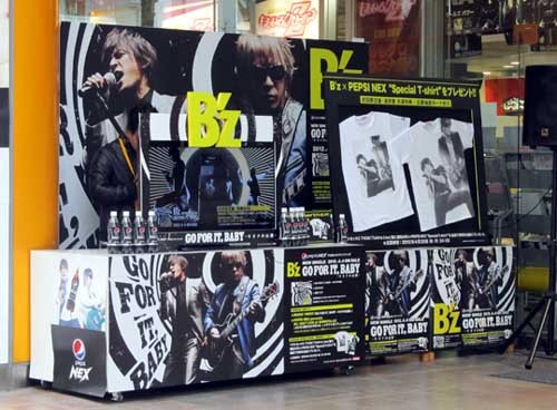 《タワーレコード渋谷店 店頭Day》2012/04/04 リリース 「GO FOR IT, BABY -キオクの山脈-」 「店頭DAY 1」 はこちら店頭のモニターでは特典映像のほか、メイキングとインタビューの映像も流れていました。B'z×PEPSI NEX “Special T-shirt”ラベルにはVERMILLIONRECORDSと入っています。この写真でも分かるのではないかと思うんですが、右のBタイプのほうは、プリントのある部分だけやや黄色っぽいです。タワレコ店内に入ってすぐのところ。祝!!!!! シングル通算50作!!というポップは、一番下に私は一生 B'zについてきます。と書いてあります。2階のB'zのコーナーにも、同じポップがありました。いいですね~、このポップ。店員さんの愛があふれてます。このポップも 最高だっ!《SHIBUYA TSUTAYA 1階フロア》三千里薬局側の入口から見たところです。1階の天井はB'zだらけでした。この位置からは見えませんが、1階のレジカウンター後方の壁にも、かなり大きいパネルが飾られています。ただし、この日の店頭DAYは悪天候のため中止。普段は、この柱を取り囲むようなレイアウトで店頭DAYが行われています。TSUTAYAのセンター街側の入口横にある倉庫?です。この写真を撮るちょっと前まで、このパネルはセンター街に向けて置かれていたんですが、写真を撮ろうとした瞬間に片付けが始まってしまいました。4日は天気も回復したので、いつもどおり店頭DAYが行われたでしょう。ちなみに、最後の写真を撮ったのが16時少し前です。普段は時間が遅くなるほど人が多くなってきますが、この日は、時間がたつにつれて人が少なくなっていきました。余談です。3日は、仕事帰りにCDを買いに行くつもりだったのに、荒天のために断念した方も多かったんじゃないでしょうか。私は東急の電車が止まったり、大幅な遅れが出ると、携帯にメールが来るように登録してあります。3日は15時過ぎに、さらに風が強くなったら運行を見合わせる可能性があることと、早めに帰宅する人にあわせて16時以降に電車を増発するという案内が来ました。16時過ぎ、TSUTAYAの写真を撮った後、田園都市線の渋谷駅ホームに行くと、ホームは人で埋まっていました。ほとんどが下り方面の電車に乗る人でした。ちなみに、田園都市線・渋谷駅のホームは1本だけです。駅員さんが無線で 「リンデンがどうの」 と連絡を取っていました。増発した電車は 「臨電 (臨時電車)」 っていうんですね。最初に来た電車は満杯で乗れなかったので並んで次を待っていたら、通常は上り方面の電車が止まるホームの反対側に、その 「臨電」 が来ました。それが下り方面の電車だと気づかなかった人も多いようで、比較的余裕のある乗車率でした。帰宅すると、東急の運行情報メールが次々届きました。電車は18時前から1時間ほど止まり、運行を再開した後もダイヤはかなり乱れていたようです。ニュースでは、渋谷駅のバスターミナルが長蛇の列になっているようすなどを伝えていました。