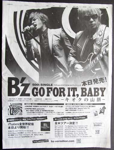 【追記しました】今日の朝日新聞朝刊にB'zの全面広告(1ページ)が載っています。内容は、「GO FOR IT, BABY -キオクの山脈-」 リリース関連、全米ツアー、「Into Free -Dangan-」 の全世界配信について。読売新聞にも載っているようです。【追記】「GO FOR IT, BABY -キオクの山脈-」 は、フライヤー等の配布物はないようです。タワレコの店頭DAYの様子は、準備が出来次第、ご紹介します。余談 4/03に見た夢小さな劇場のようなところに稲葉さんが出演している。ただ、ライブなのかどうか分からない。夢のなかでの印象は、トークショーか映画の初日舞台挨拶のような感じ。稲葉さんが突然、ステージを降りて、下手端の通路の階段を上がってきて、一番端に座っていた私の横で通路に座り込んだ。周りの人たちが稲葉さんに触ろうと手を伸ばす。ただみんな、立ち上がりはしても席から動こうとはしない。気が付いたら稲葉さんは、ひとつ内側の通路をステージに向かって戻り始めていた。後ろから見たら、髪型が 「ultra soul」 のMVのような感じになっていて、短めの茶髪で立っていた。これは全米ツアーのことだったんでしょうか。ただ、全員おとなしく座っていてライブという雰囲気じゃなかったし、松本さんの気配はどこにもなかったんですけど。(松本さん、すいません(^^;ゞ)夢ではありませんが、昨日は、しばらく新聞広告が載ってないな~、って考えていました。で、見開きだと大きすぎてフレームに入れて飾れないから、1ページの全面広告のほうがいいな、とも思ってました。希望通りです(笑)
