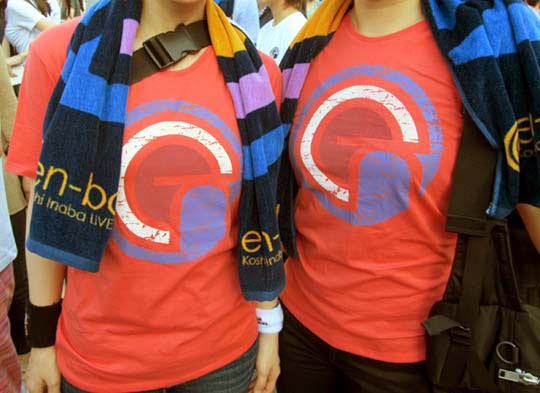Koshi Inaba LIVE 2014 ~en-ball~6/05(木)~20(金) 品川ステラボール (東京)グッズのTシャツを着ていた方たちに写真を撮らせていただきました。快く撮影に応じてくださった皆さん、ありがとうございました。通販で購入される際の参考にでもなればいいのですが。UネックTシャツ インディアンレッド光線の加減によって赤やピンクにも見えたりしますが、実際の色合いはオレンジに近いです。UネックTシャツ ライトネイビーこちらも、「ネイビー」 というより紫に近いです。Tシャツ ホワイトTシャツ ブラックVネックシャツ マスタードイエローとTシャツ ブラックUネックTシャツ ホワイト (ファイナルグッズ)左の女性はMサイズだそうです。fc_satokoさんの写真これが噂のファイナルTシャツ! うしろに大島さんのツンツンヘアーが…♡笑SATOKOさんがアップした写真は鏡に写った自分の姿を撮っているため左右が逆なので、反転させました。スポーツタオルこうやって広げるとオレンジが目立ちますが、首に掛けると胸元にたれたブルーとピンクのほうが目に入りやすくなります。そのせいか、ファイナルグッズのUネックTシャツを着て首に掛けると、色合いがとてもマッチしていました。ガチャガチャの日替わりブレスレット黄色は4日目 (6/10)、黒は最終日です。6日目 (6/13) はネイビー、9日目 (6/19) はエメラルドグリーンだったようです。金属部分がゴールドなのは最終日のみです。結び目を引っ張ると長さが調節できるようになっています。グッズ売場通路のプレートグッズ売場 (Club eX) 入口スタッフ用ワークシャツ今回、スタッフの方は皆さん、ワークシャツでした。受け持ちによってバックプリントが違っていたようで、背中にオレンジの部分がある方たちはグッズ売場や入場の誘導係、白と黒だけの方たちは窓口係のようでした。ボケましたm(__;)m「not enemy」 は 「敵ではない」。つまり 「仲間」 だという意味を込めて、「STAFF」 の代わりに使ったんでしょうか。グッズ売場の中央にはグッズが展示してありました。最終日はその真ん中に、ファイナルグッズのUネックTシャツを着たマネキンが置かれましたが、そのマネキン、頭に Tシャツの 「178MAN」 がかぶっているのと同じ、ブルーとピンクのマスクをかぶっていました。あのマスクもセットで付いてるといいのに、と思ったんですが、夕方にはマネキンの頭部だけなくなっていました。セットで付いてると思い込んでしまう人が多かったんでしょうか。 (そんなことはないか)また、「178MAN」 を厚紙に描いて切り出した人形? が、展示物の間のあちこちに置いてあって、サマーパーカーのポケットからも顔を出していました。すごくかわいかったので写真でご紹介したかったんですが、残念ながら撮影禁止でした。ところで、~en-ball~のパンフレットは表紙のロゴの中に犬が顔をのぞかせていますが、実はこれ稲葉さんの愛犬です。 (真ん中から少し後ろのページにも登場しています)散歩中の稲葉さんを目撃された方がいまして、その方によると、犬種はたぶんミディアムプードル、色は茶です。トリミングはしていないため、ムクムクしています。稲葉さんは会報101号のインタビューで写真の話になったとき「最近撮ったの見ると全部、犬!自分でバカじゃないかなって思うもん(笑)一覧で見ると、全部犬の茶色い毛がバーって並んでて気持ち悪い(笑)」 (22ページ左端の段)と言われています。いまはそれぐらい愛犬に夢中なので、こっそりパンフレットにも登場させたのかもしれませんね。稲葉さんソロライブ~en-ball~ フォトレポートPart1 ロビー編