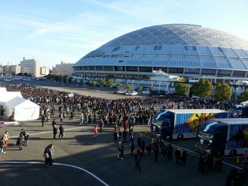 グッズ売場は駐車場。 バーミリオンカード専用売場はグッズ売場の左端。 その左隣にB'z PARTYブース。 ガチャガチャとCD売場は2階デッキです。 現金・その他カード用売場の行列は15持現在、地上から2階デッキに上がって、3ゲートの先まで延びています。 「開演に間に合わない可能性がある」と繰り返しアナウンスされています。 バーミリオンカードをお持ちの方はこの行列には並ばないでください。 スタッフの方が、「3時のカウント、8523です」と言っているのが聞こえました。 ガチャガチャに行列はありません。