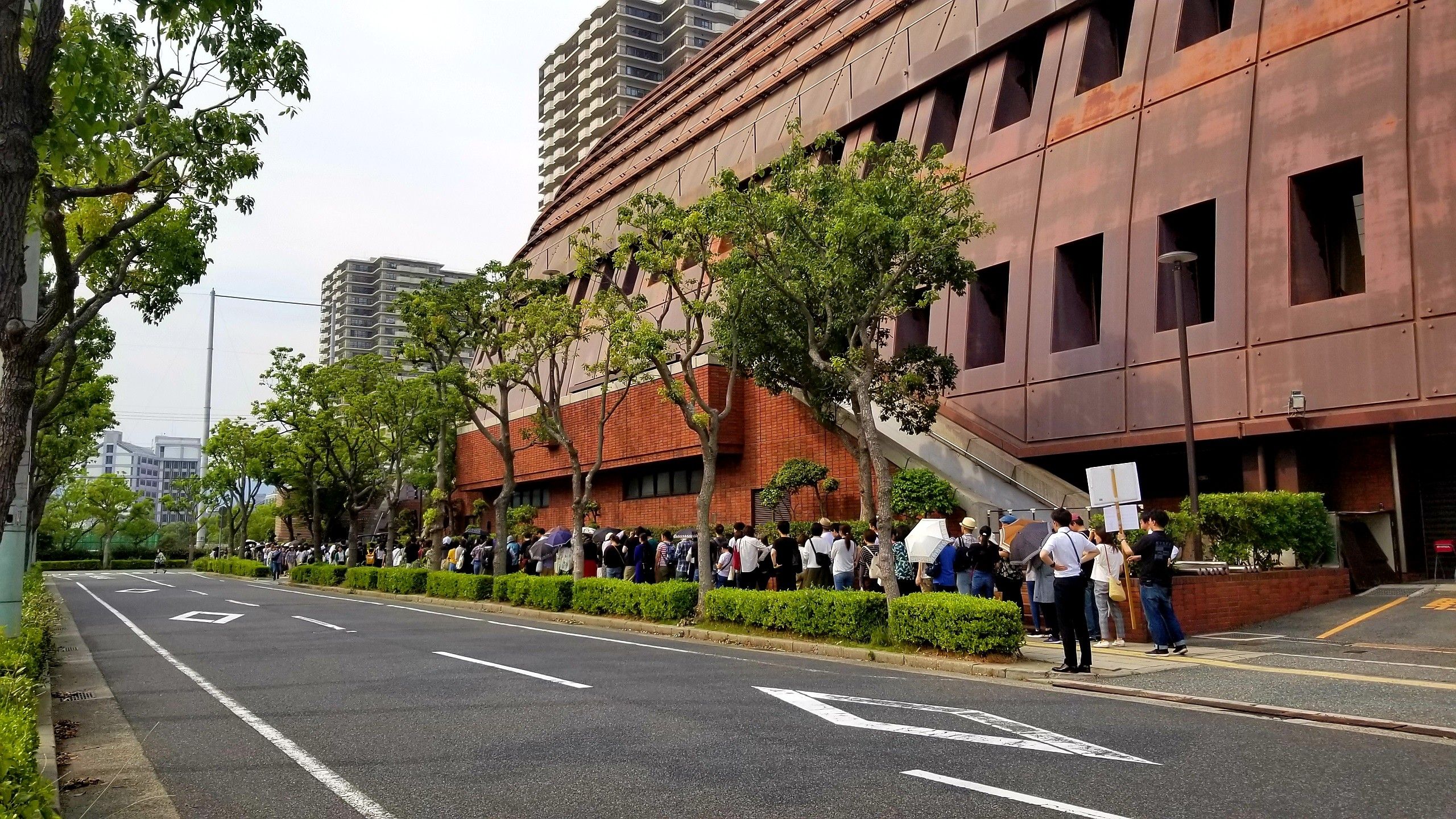 15:20現在、グッズ行列は初日に比べるとかなり短くなっています。 バーミリオンカード用売り場はガラガラです。 売り切れは、メモリアルプレートのみです。 現金その他用売場の行列 (手前) 傘のせいで列が広がって長く見えますが、実際の長さは初日の半分以下だと思います。 左は入場列です。