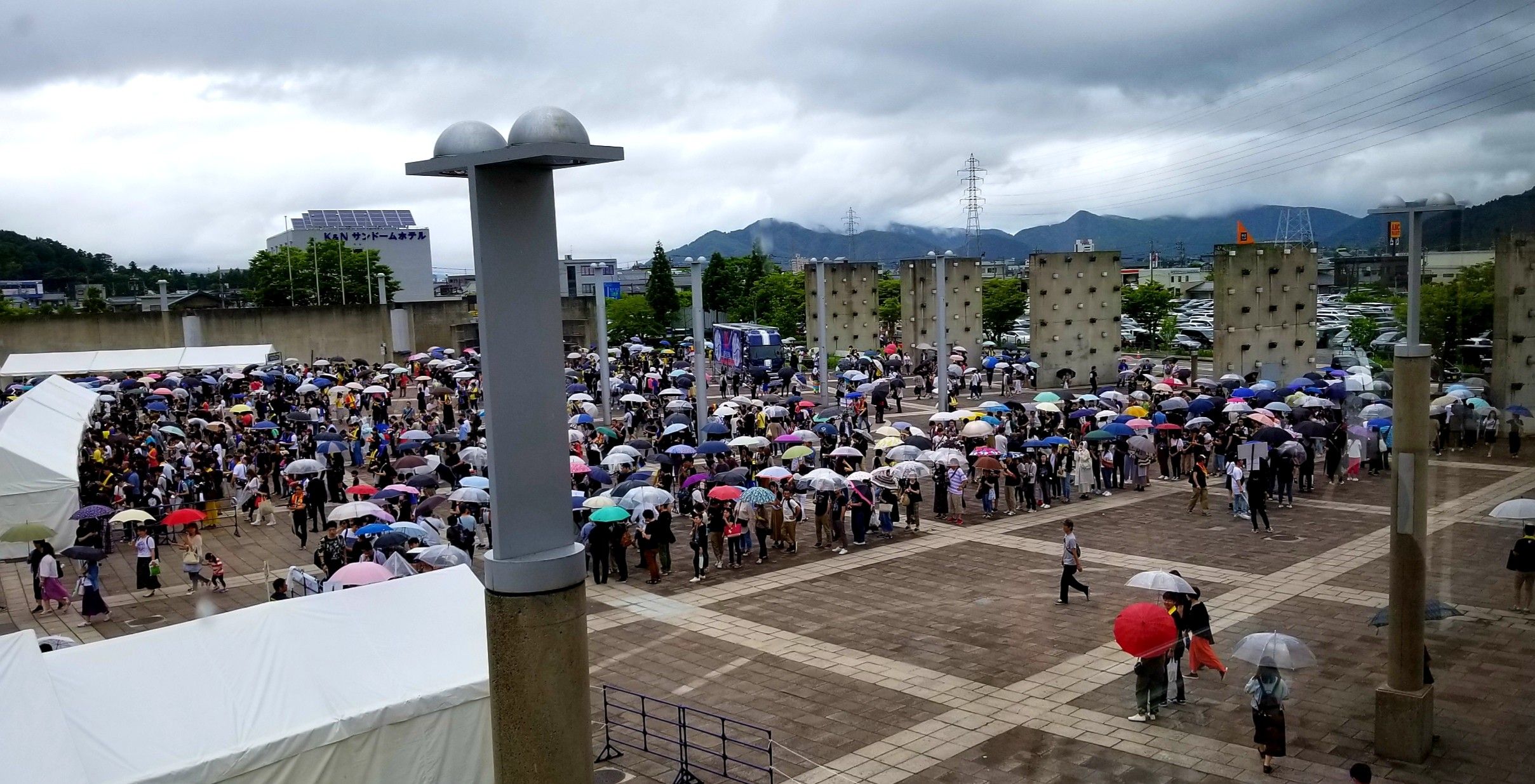 15:50現在、現金その他用売場の行列は延びる方向が変わりましたが、長さは13時時点と変わらず。 さらに続々と並ぶ人が来ているので、これからさらに長くなるかもしれません。 バーミリオンカード用売り場の行列はかなり短くなりました。 現金その他用売場 行列最後尾 (会場裏側) バーミリオンカード用売り場最後尾 売り切れはメモリアルプレートのみです。 ガチャガチャはまだ十分あるようです。 ツアートラックの配置は2日目と同じです。