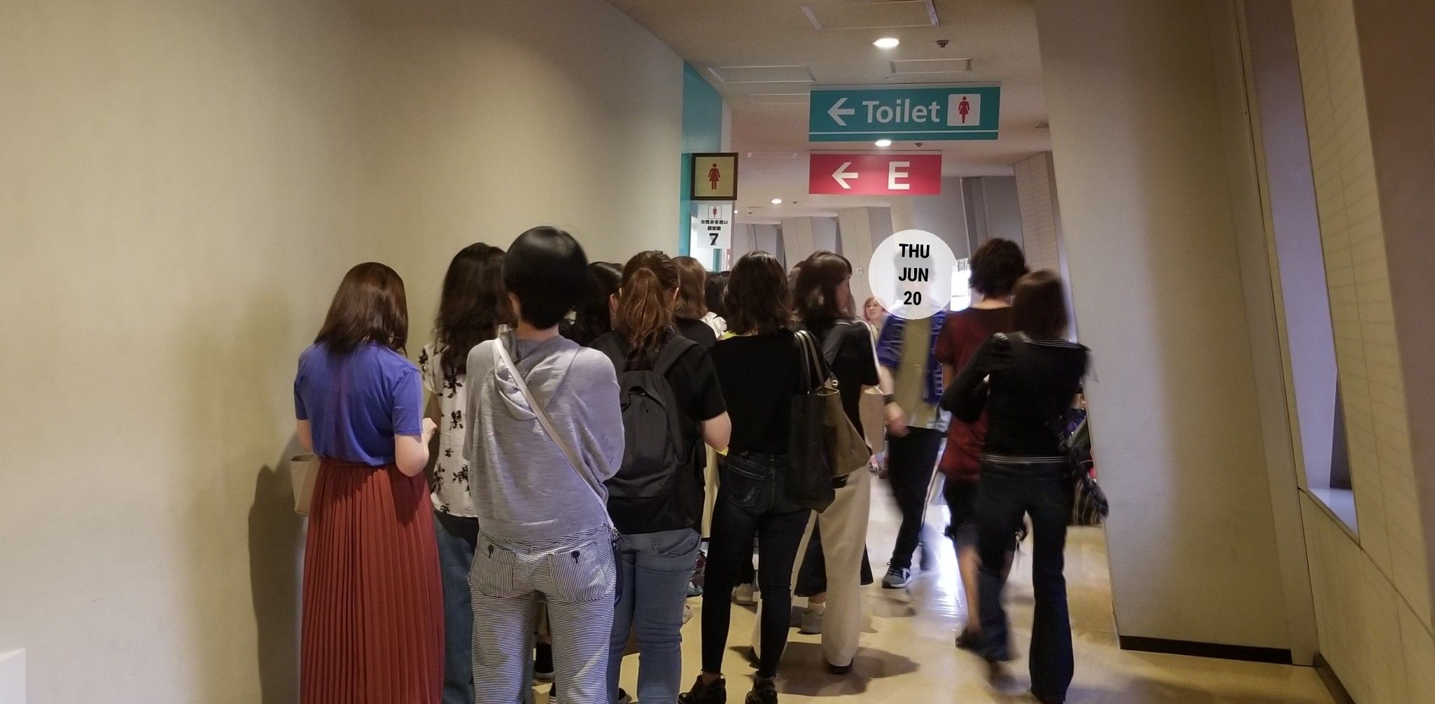 男性用トイレ、初日は右側のみでしたが、2日目は左側 (南スタンド) も利用可能です。 右側のトイレは長蛇の列になっています。 女性用は左側のほうが混んでいます。 右は16時に並んで、5分かかりませんでした。 右側の、通路のいちばん奥まで進んでください。