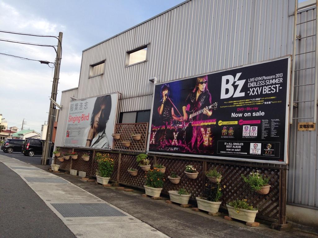 イナバ化粧品店の最寄り駅近くにあったB'zの看板。のどかな雰囲気の道の中で明らかに浮いてましたw