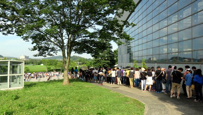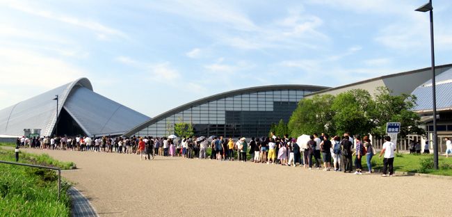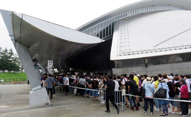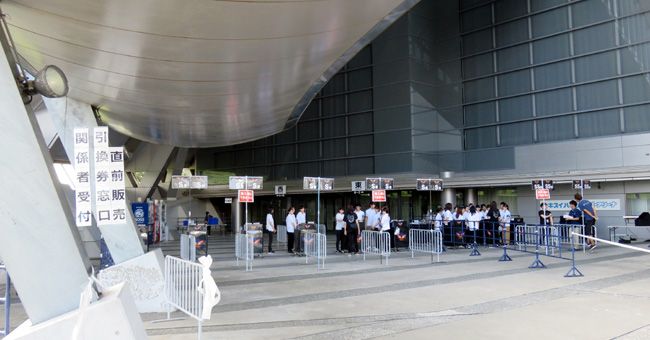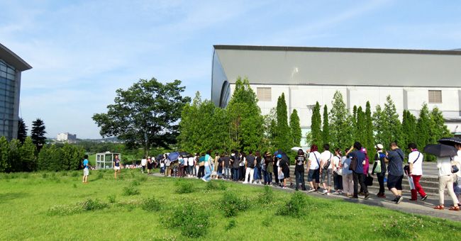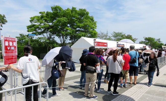 行列は最長時、サブアリーナの隣にあるプール棟の横の坂を上がり