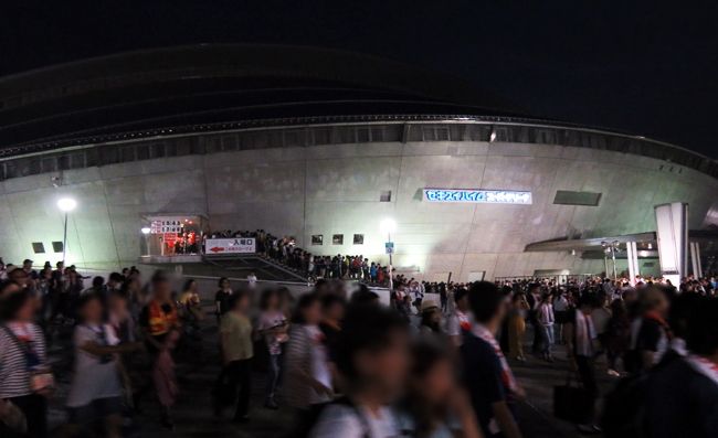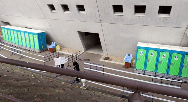 アリーナ席の仮設トイレ、上の写真の左端あたりです。