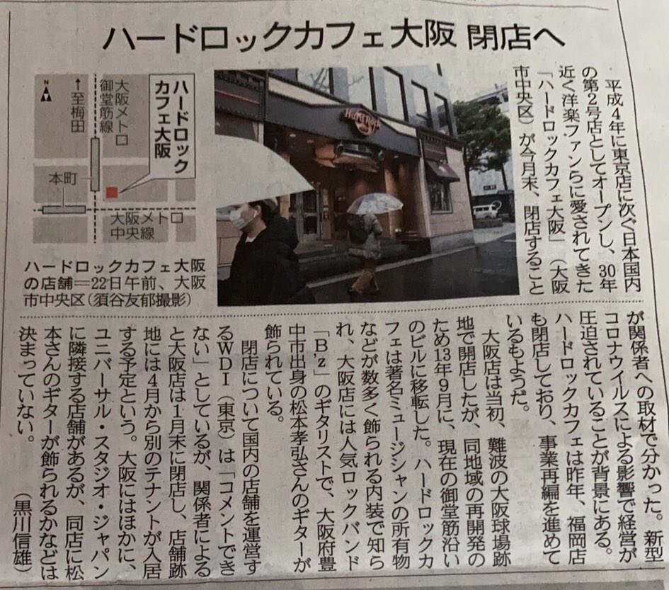 〈独自〉ハードロックカフェ大阪が閉店へ 約30年の歴史に幕 コロナ禍背景に事業再編か https://t.co/UtnjHxahQt