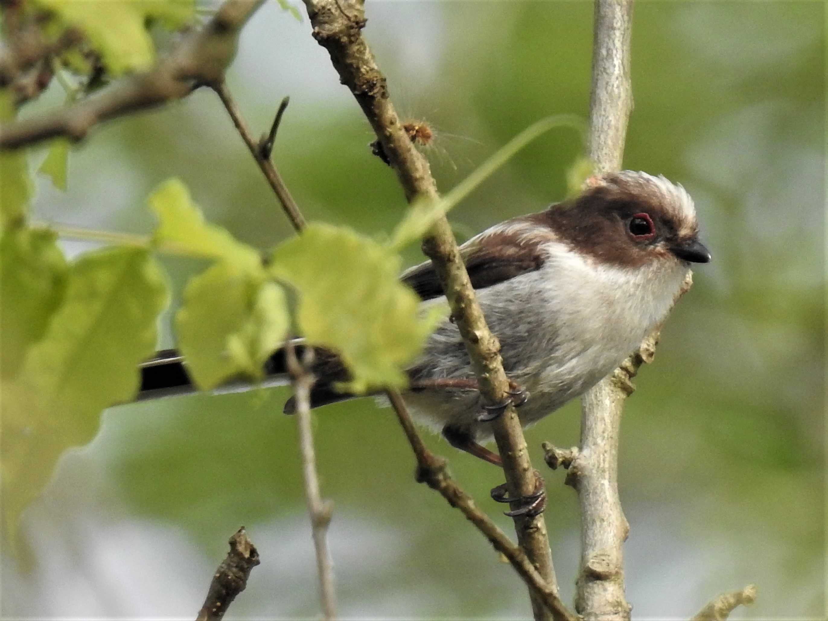 。エナガの地鳴きが聞こえてきたので、樹上にカメラを向けたら何かエナガと違うような感じがした。初見のエナガの幼鳥(若鳥?)だった。成鳥との違いは羽が茶色でアイリングも赤みを帯びている。エナガの幼鳥その後ソウシチョウがやってきてすぐにエナガは退散。ソウシチョウヤマガラもまじっていたが画像は得られず。そしてコゲラが折れた枝を突いているのが見えた。コゲラこの前までいたキビタキは鳴き声もせず姿がなかった。