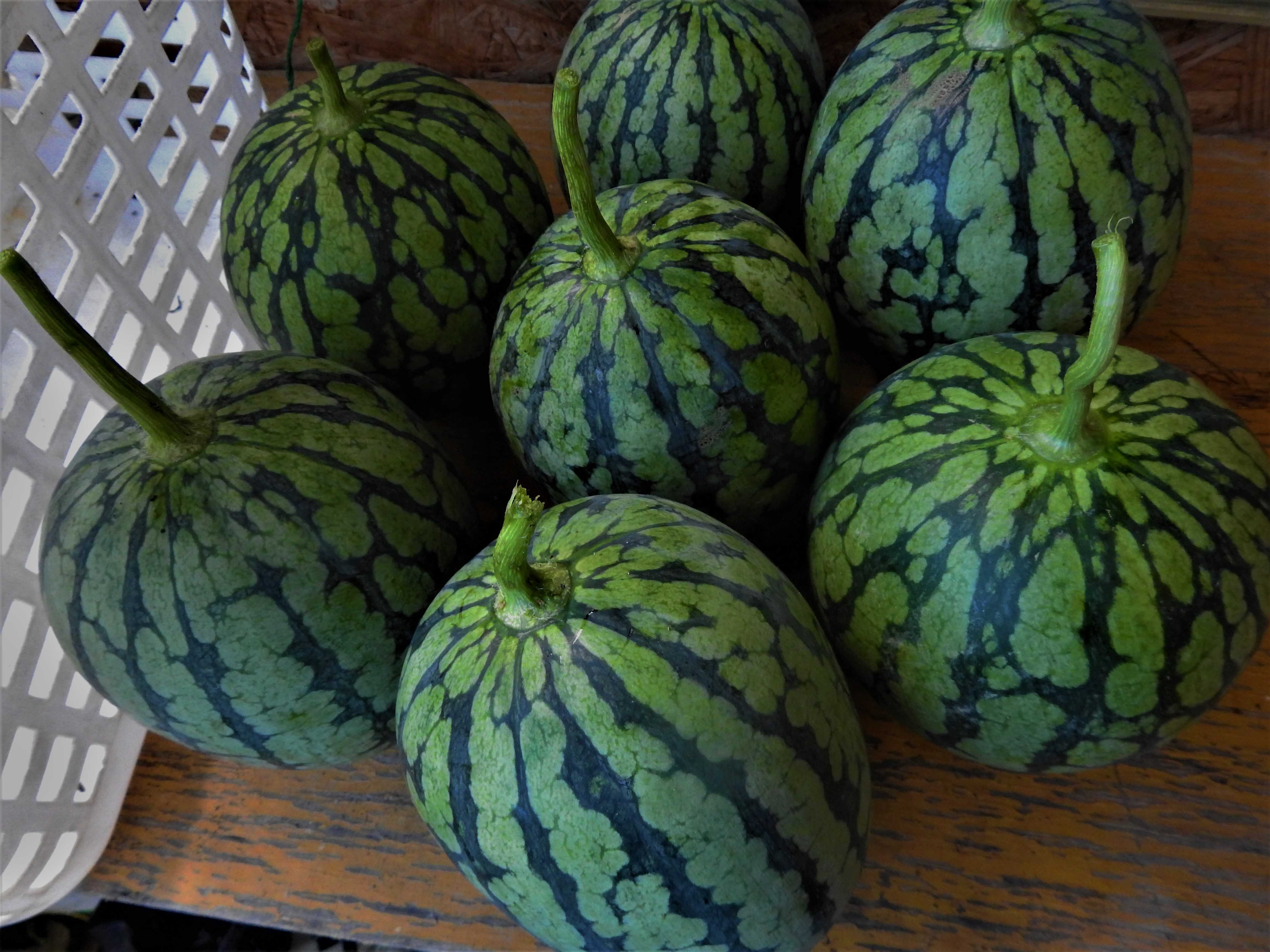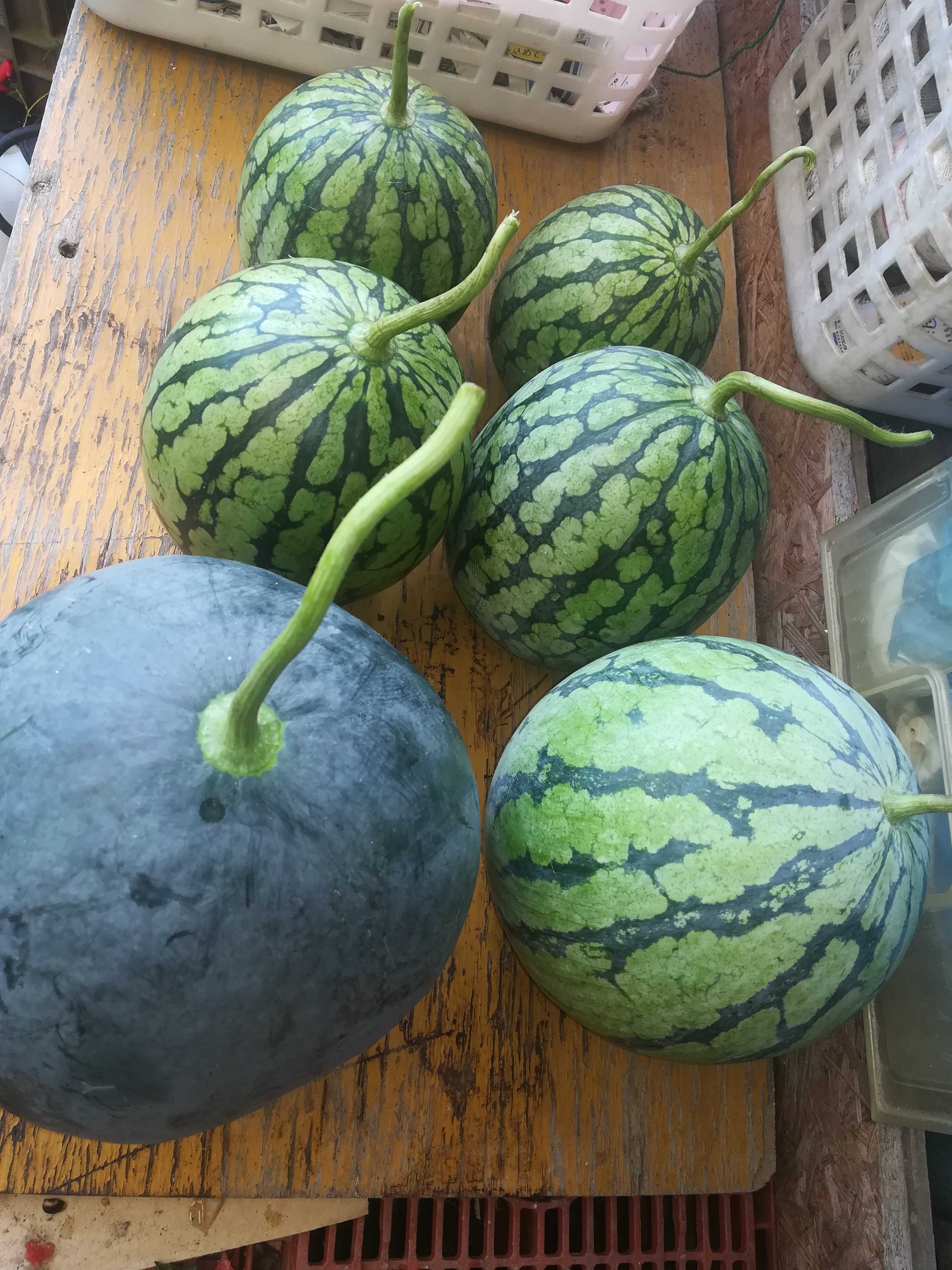 5月末に植え付けた露地植えの種ごと食べられるとの表示があった黒皮西瓜を初収穫した。ここはネット囲いしてなかったのでアライグマの標的になるかもしれないとの恐れがあったが今のところネット覆いだけで被害はない。黒皮西瓜1個の試し採り手前左、その横は縞王 その他は小玉スイカ完熟で甘さも十分トマトは相変わらず収穫は多いが残りは少なくなっているキュウリはほそぼそとオクラはますます元気