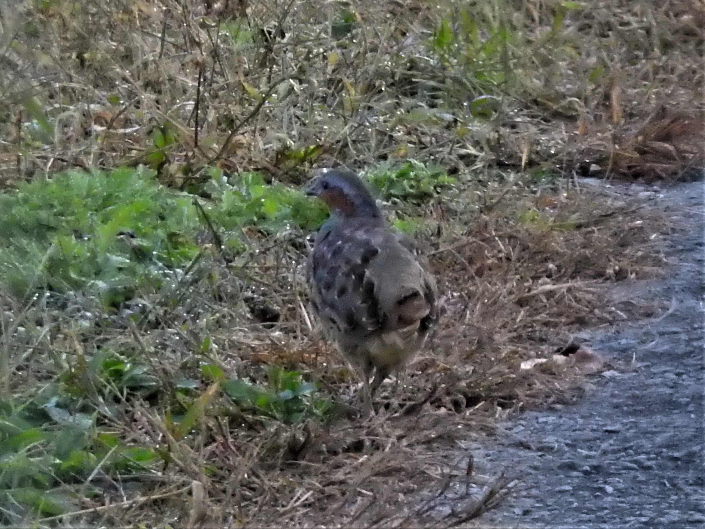 山の畑への道でコジュケイが道をあわてて横切るのが見えた。車をとめて待っていると1羽が顔を出しやがて2羽、3羽 そしてなんと6羽も。いずれも子供と思えるが親もいたのかもしれない。ちょっと見にくいですが6羽が確認できました。