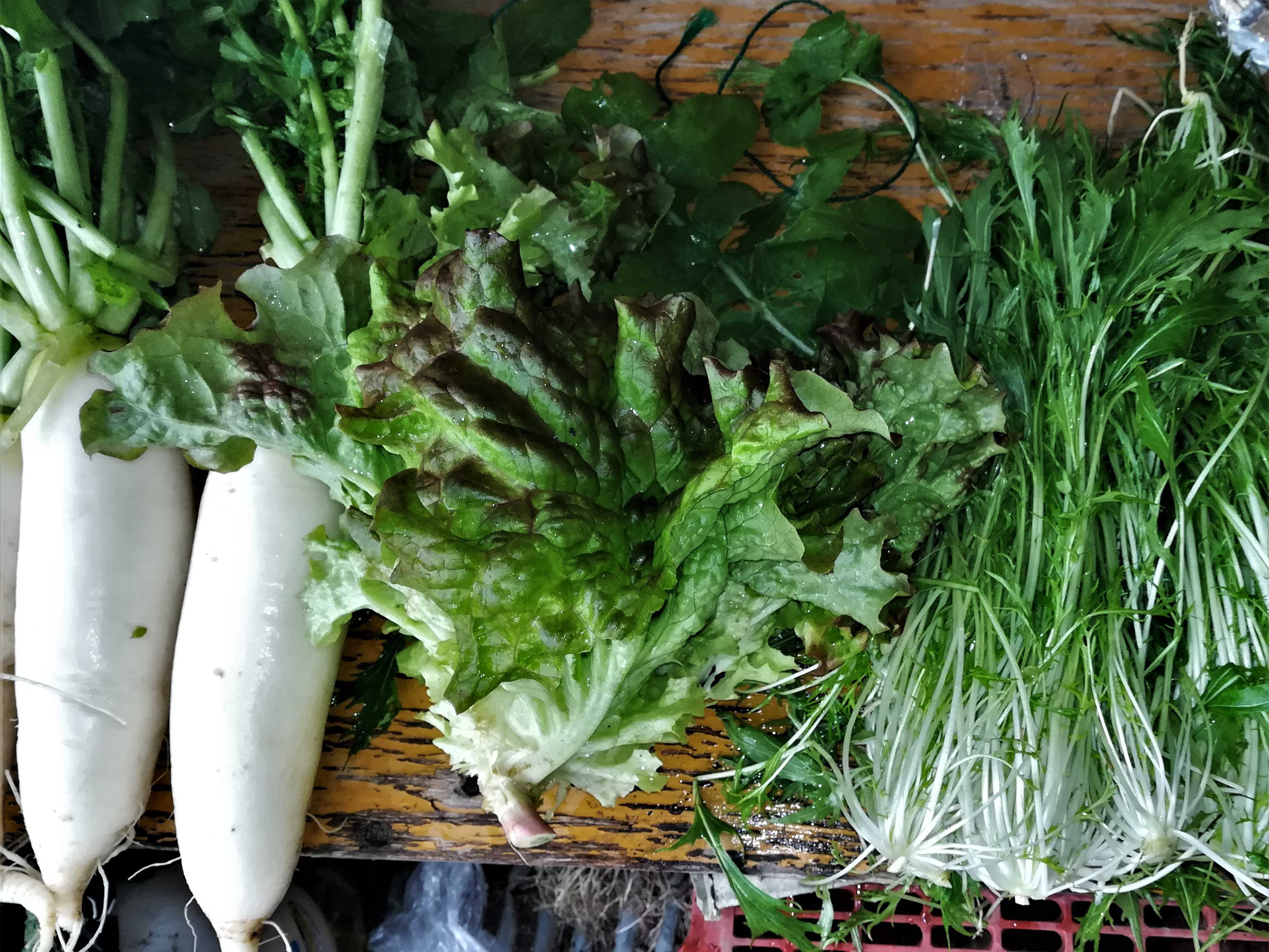 少し寒さがぬるんだ感があるこの日今年最後の収穫に行った。いつもの収穫9種類、キャベツの収穫を忘れた。大根、白菜、法蓮草、青梗菜、春菊、小松菜、鰹菜、サニーレタス、パクチー水桶の凍っていたので氷を割って、野菜洗い用の水を確保した。