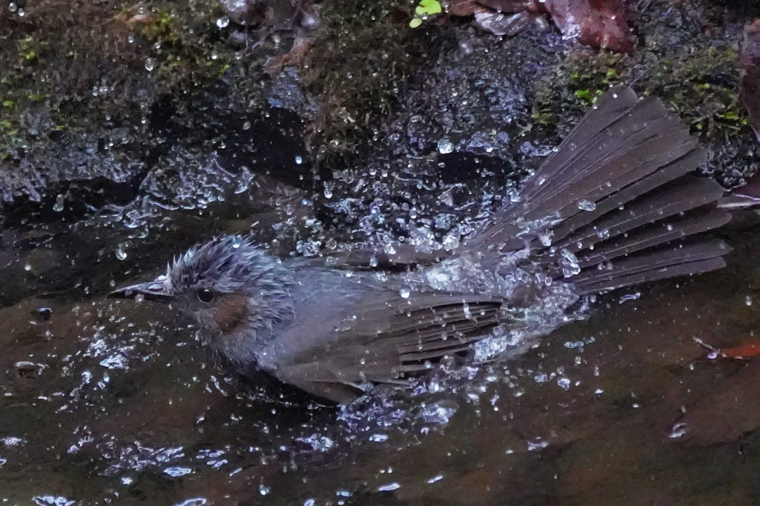 水場は日の射さない少し暗かった。その中ヒヨドリさんが水浴を満喫していた。水浴び後にこちらを向いて喜びの鳴き声?同じ場所にきていた野鳥さんメジロヤマガラセンダイムシクイこちらは水浴び後の羽繕い