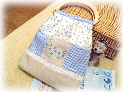 いぬふぐりの刺繍、リネンの布地、木製の持ち手。。。