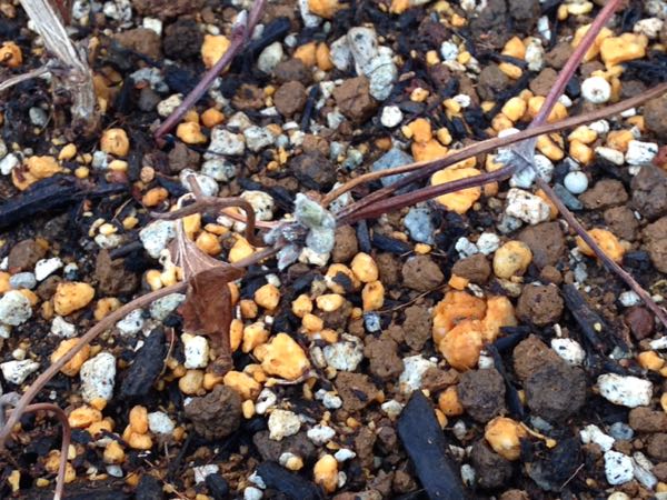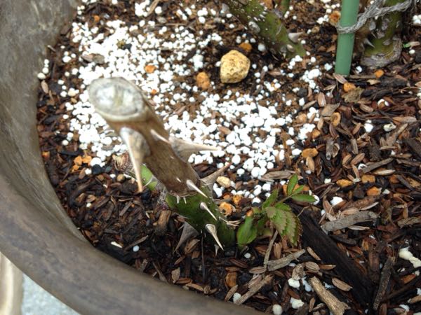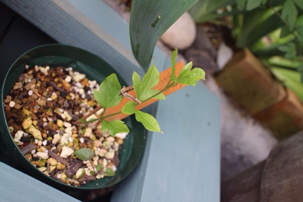 2015年7月にペットボトルでの見え〜る挿しに挑戦していた、グリーンアイス 冬の間屋内で、安定した感じを見せていたので、ペットボトルをザクザクカットして出してみた 1番左。 挿した枝は枯れていますが、脇から新しい芽が出ています。挿した4本全部に発根確認できました。 ほぼ鹿沼土で、黒ポットにお引越し完了。2、3日ほど日陰に置いてから外に出します。 親株が昨年調子を崩していたので、この子株を大事に育てたいと思います。
