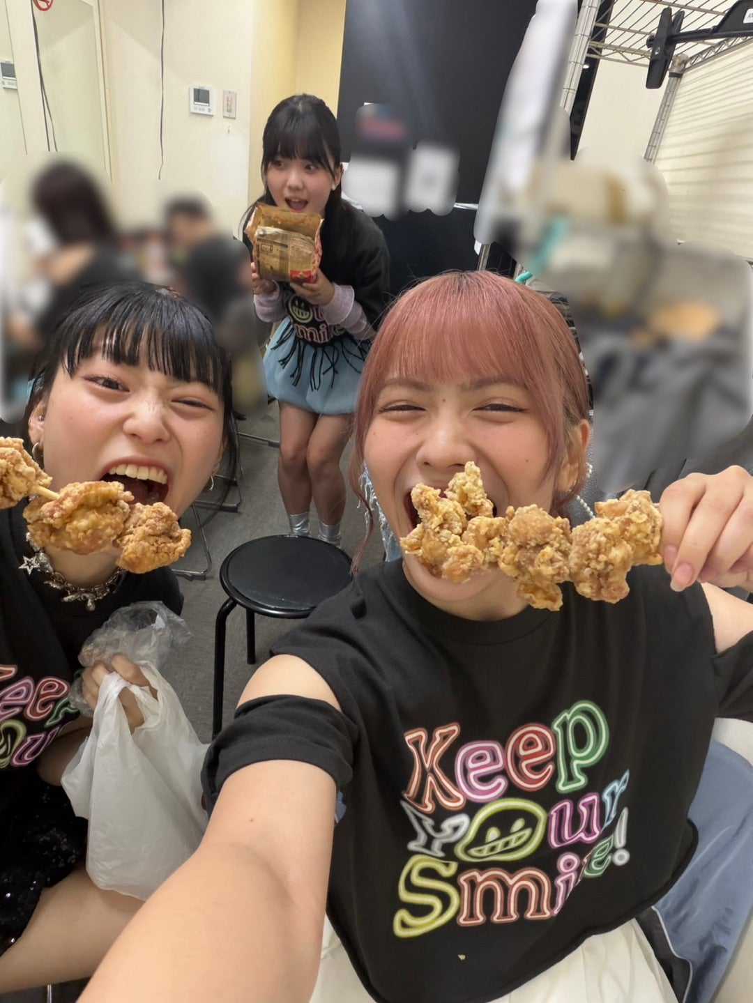 唐揚げを豪快に頬張るりんちゃんとしおんぬの後ろで、袋を掲げてポーズをとる桃羽ちゃん。こうやって、いつも元気で賑やかな、アンジュの色に染まっていくんですね・・・。