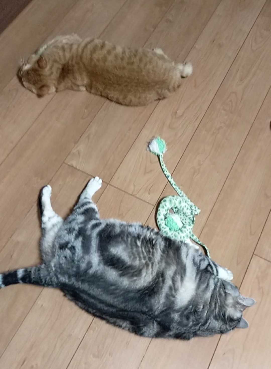 うちの猫たち。 このまたたびが好きです。 酔っ払ってる。 猫なら誰でもまたたびで酔っ払うでしょ。と思われると思いますが、 人がお酒に強い弱い、味の好き嫌いがあるように、 猫にもまたたびの種類の好き嫌い、酔いやすい、酔いにくいがあるみたい。 うちの茶トラ猫のトッティとはちわれのポルコめちゃめちゃ酔いやすい。 逆にアメショのぽむはそんなに酔わない。 酔い方もそれそれで、 クニャクニャゴロゴロするタイプ(トッティ) 暴れる、凶暴になる(ポルコ) 普段とかわらない(ぽむ) ぽむはまたたびを嗜んでる感(笑) とこんなところにも猫たちの個性が。 ちなみにうちでは、粉末のまたたびは使っていません。 ぽむにまったく効果がなかったからなんですが、粉末だと掃除が大変というのが理由です。 スプレータイプを使ってます。 使う分だけサッとスプレーできるし、長持ちだし、ワンプッシュで効果絶大。 おもちゃとかにかけられるのも良い。 猫たちの酔っ払い方は、どんなに暴れても可愛いです。 スマック またたびスプレー(30ml)【スマック】 家で使ってるのはこれ↑ natty