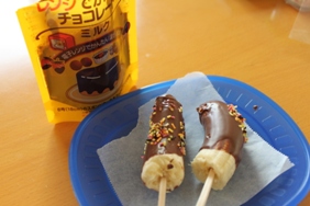 「レンジで簡単チョコレート」とチョコスプレーを買って、家でチョコバナナを作りました板チョコを溶かして作ったときは、うまくバナナにチョコがつかなくていまいちだったけど、これは簡単だしキレイにできておいしかった!!バナナが2本しかなくて、チョコがあまったので今日はバナナを買いに行っちゃいましたランキングに参加していますにほんブログ村