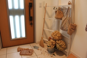 何ヶ月かピアノの上に放置していたアジサイを玄関に移動させました。(ピアノの上にアジサイの粉が落ちて汚くなってたので…)雑貨屋さんのようにさりげなく飾りたかったけど、バケツに入れるだけで悪戦苦闘・・・。 だいぶアジサイが崩れて散りました・・・。散ったアジサイの片付けついでに、玄関をお掃除。気が向いたのでタイルの雑巾がけもしました。我が家の玄関。あまり広くないので、上がり口の床を斜めにしました。斜めになっているせいで、時々次女が靴を脱ぐときに目算を誤って尻もちをついてます…。冬になって日が当たるようになったので、サンキャッチャーを玄関小窓に移動。晴れていると綺麗な虹が出ます